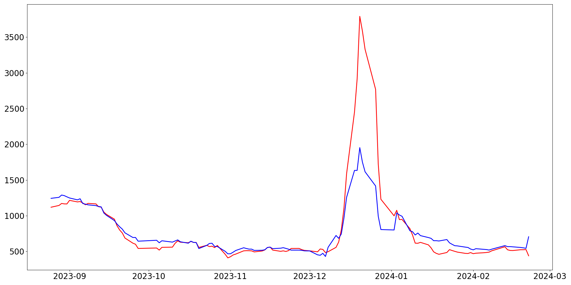 [ - : 실제값(종가) / - : 예측값(종가) ]
