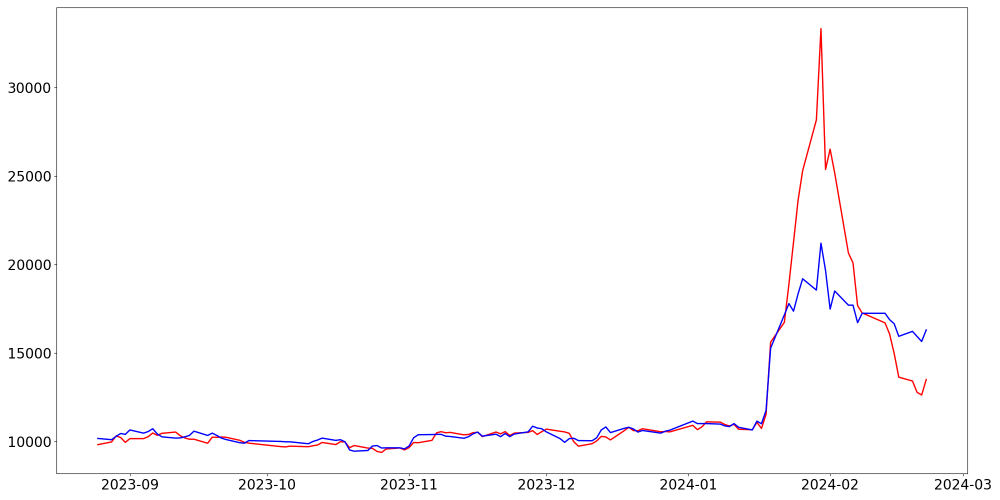 [ - : 실제값(종가) / - : 예측값(종가) ]