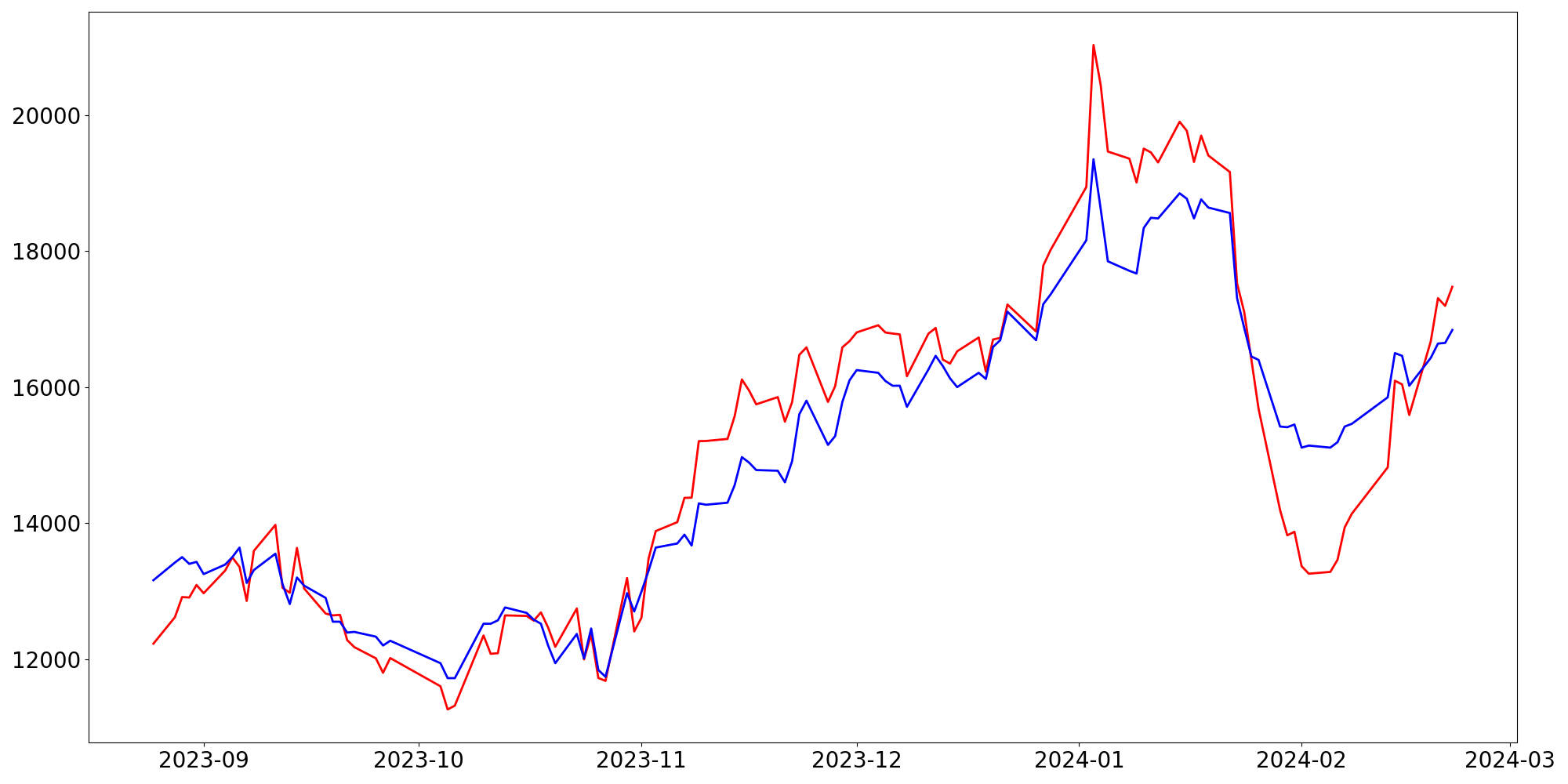 [ - : 실제값(종가) / - : 예측값(종가) ]