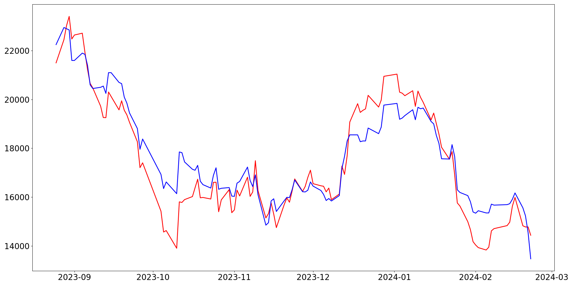 [ - : 실제값(종가) / - : 예측값(종가) ]