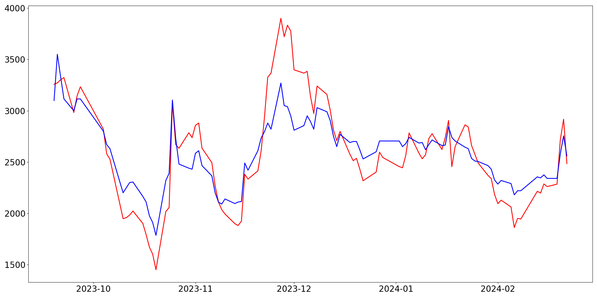 [ - : 실제값(종가) / - : 예측값(종가) ]