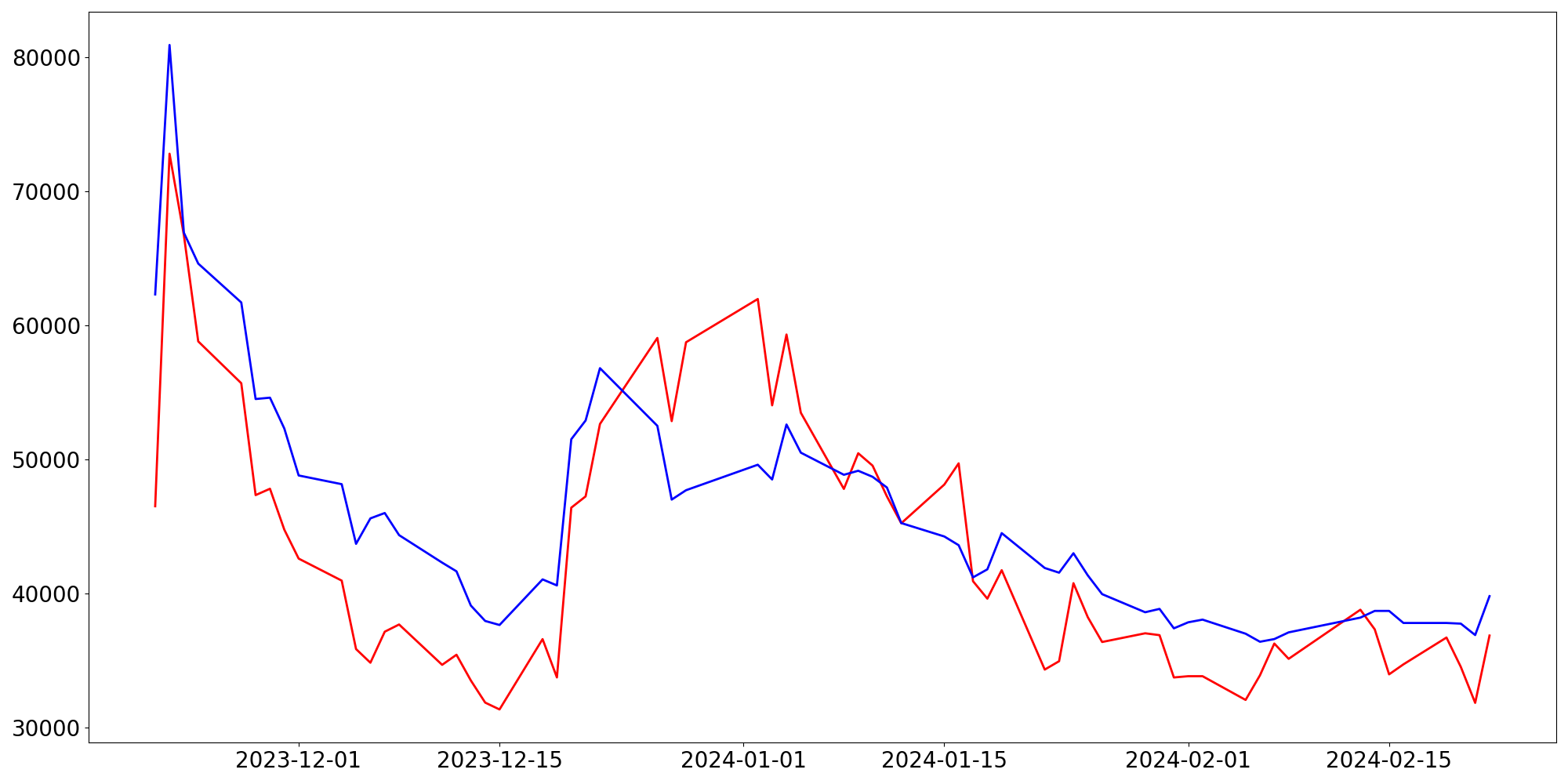 [ - : 실제값(종가) / - : 예측값(종가) ]