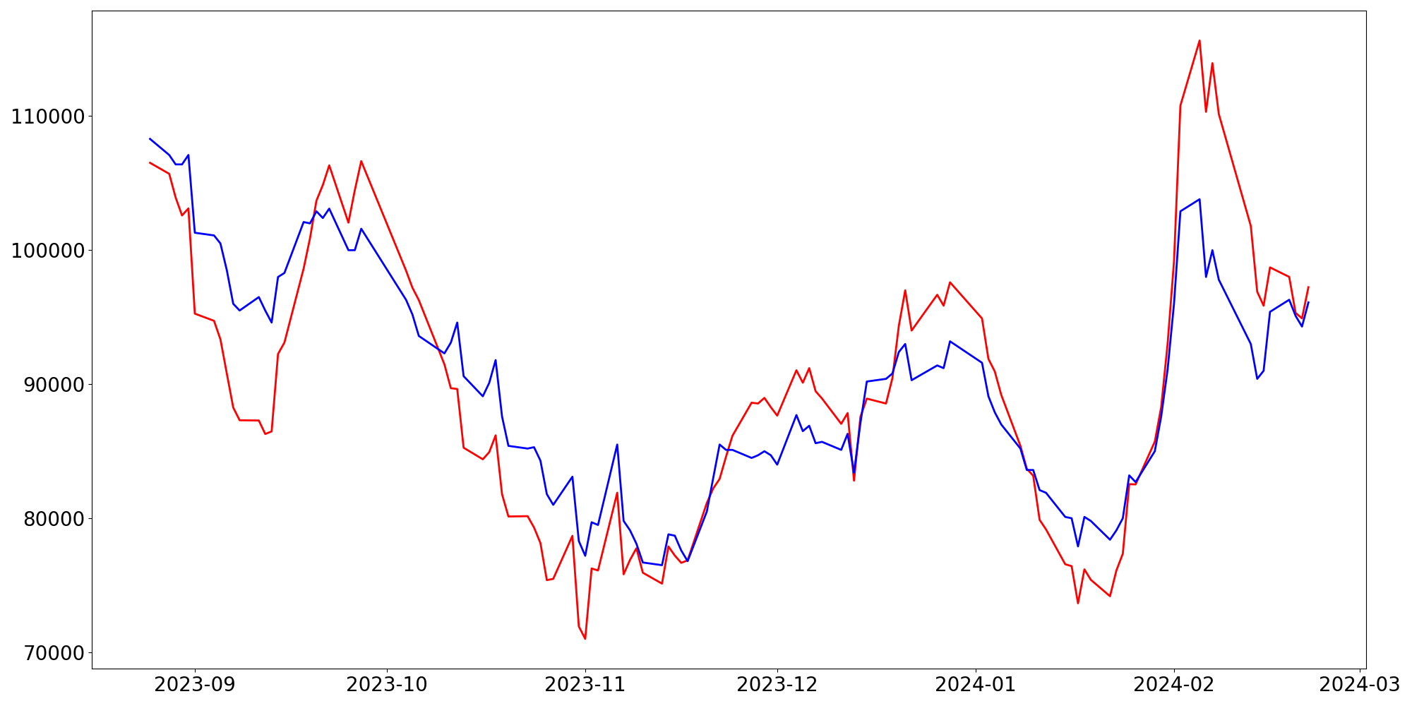 [ - : 실제값(종가) / - : 예측값(종가) ]