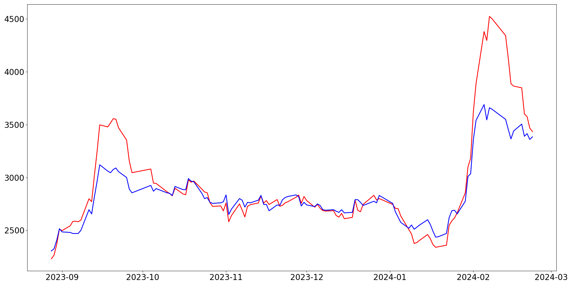 [ - : 실제값(종가) / - : 예측값(종가) ]