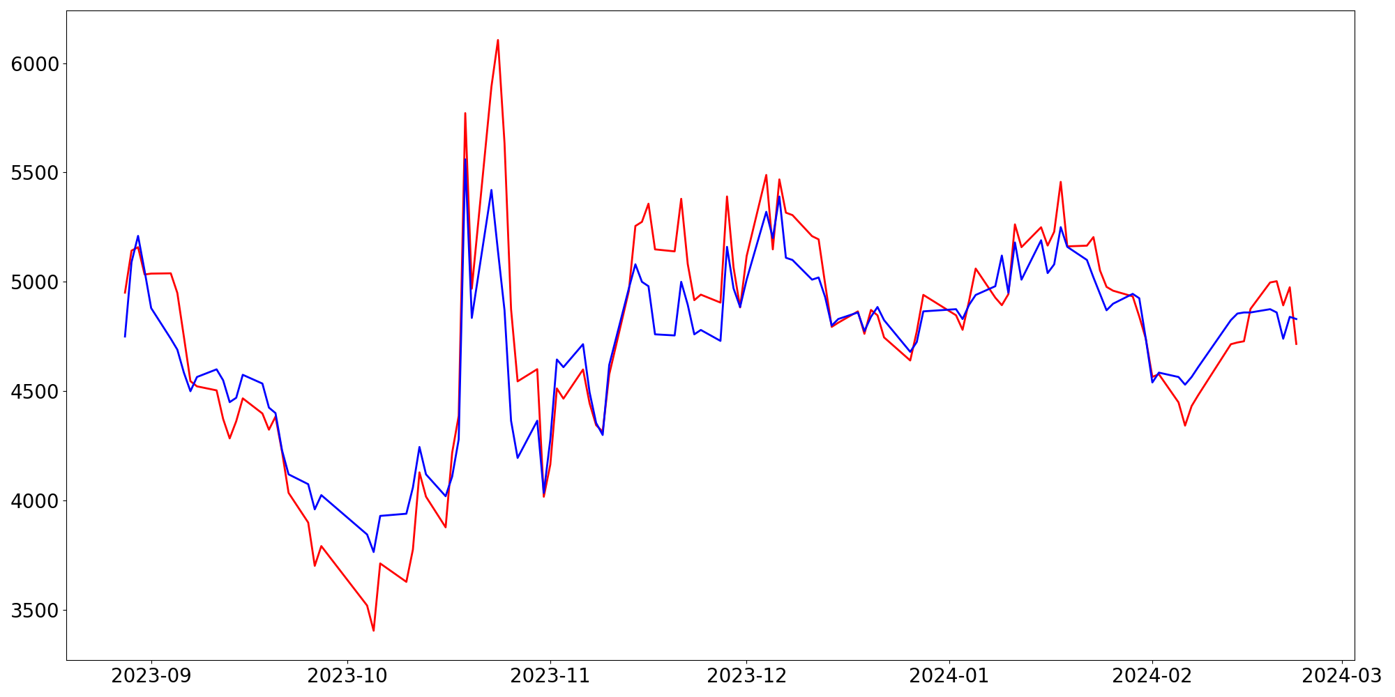 [ - : 실제값(종가) / - : 예측값(종가) ]