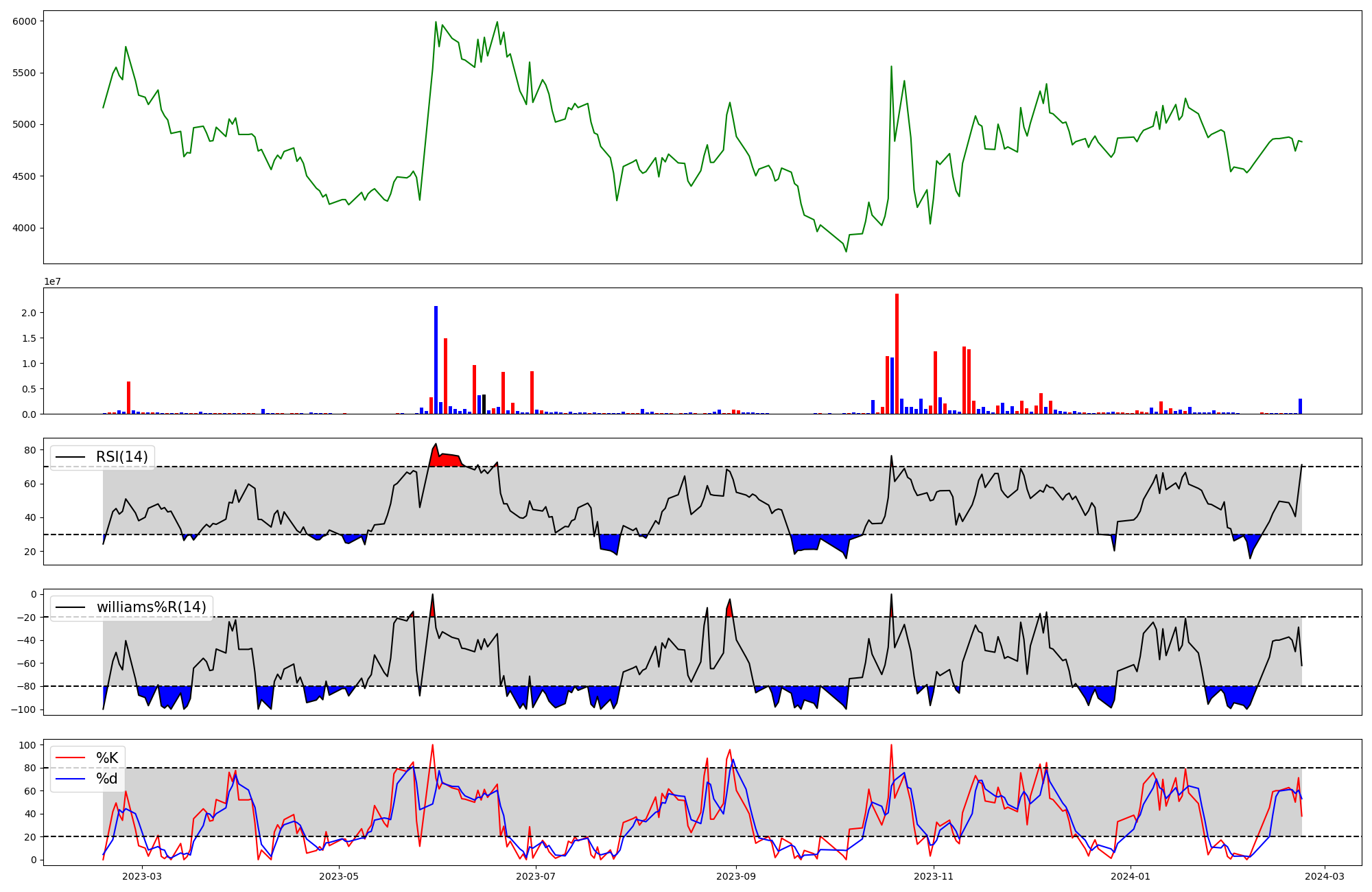 □ 중기 : 현재 종가가 중기(60일) 이동평균값(4,913원)을 하회 하여 중기적 추세 하락 중