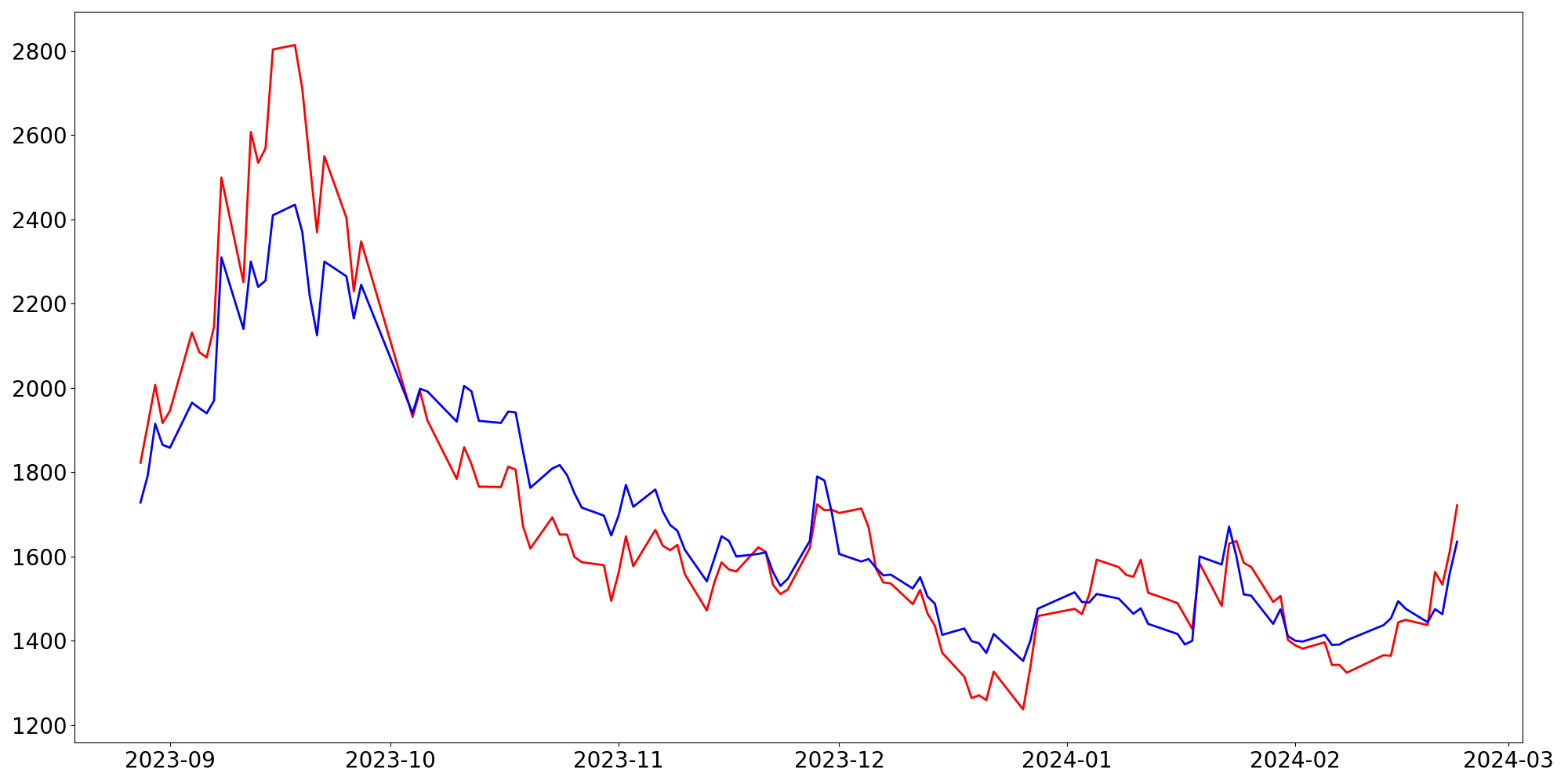 [ - : 실제값(종가) / - : 예측값(종가) ]