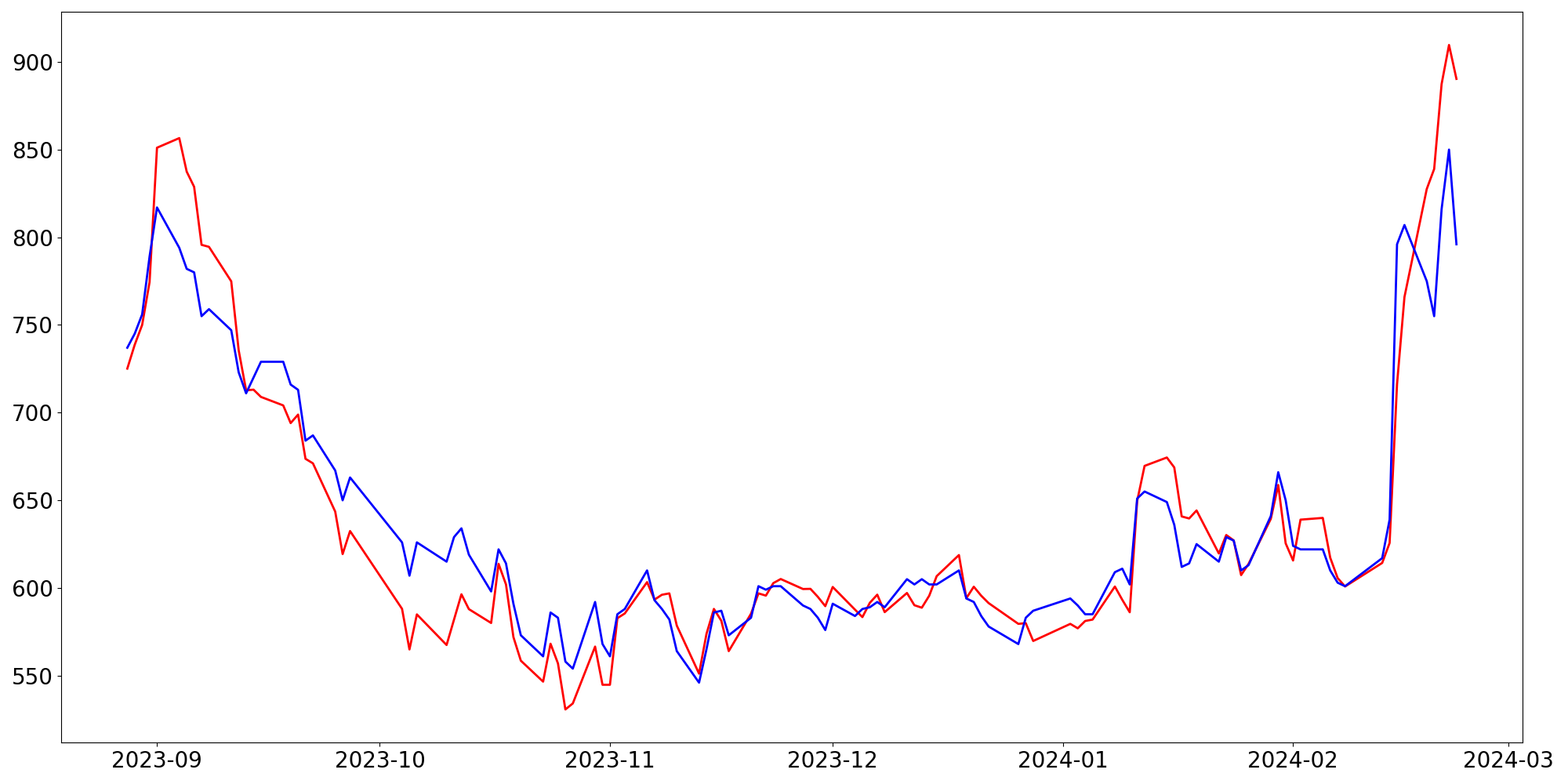 [ - : 실제값(종가) / - : 예측값(종가) ]