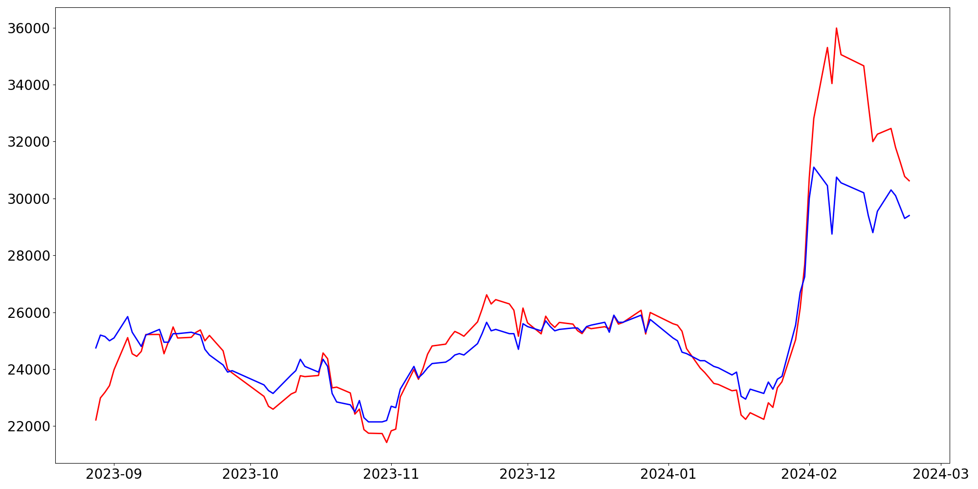 [ - : 실제값(종가) / - : 예측값(종가) ]