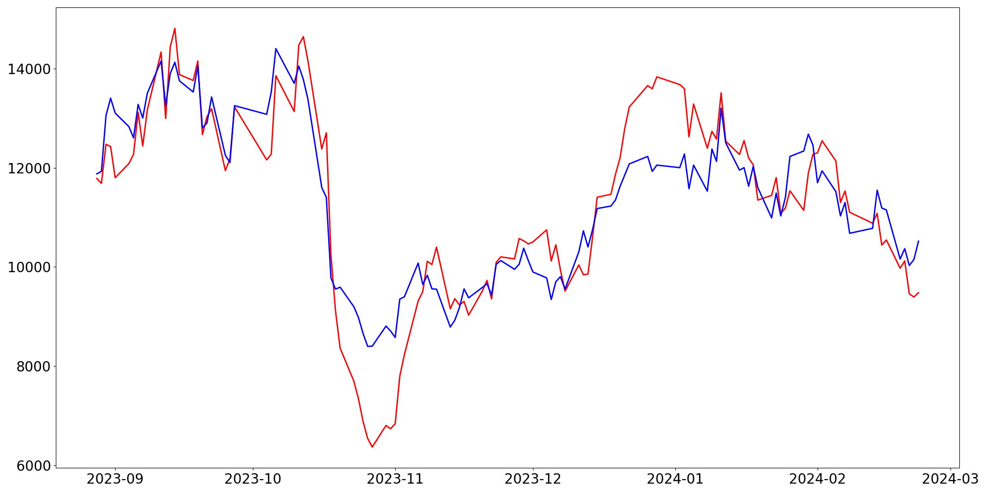 [ - : 실제값(종가) / - : 예측값(종가) ]