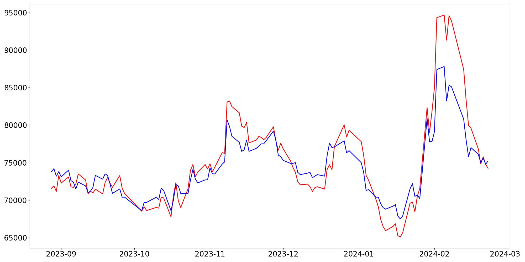 [ - : 실제값(종가) / - : 예측값(종가) ]