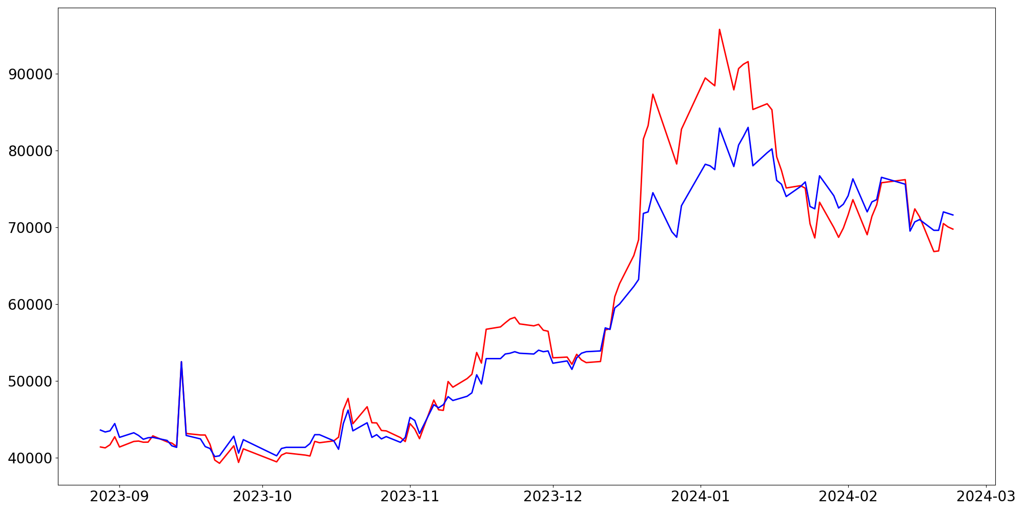 [ - : 실제값(종가) / - : 예측값(종가) ]
