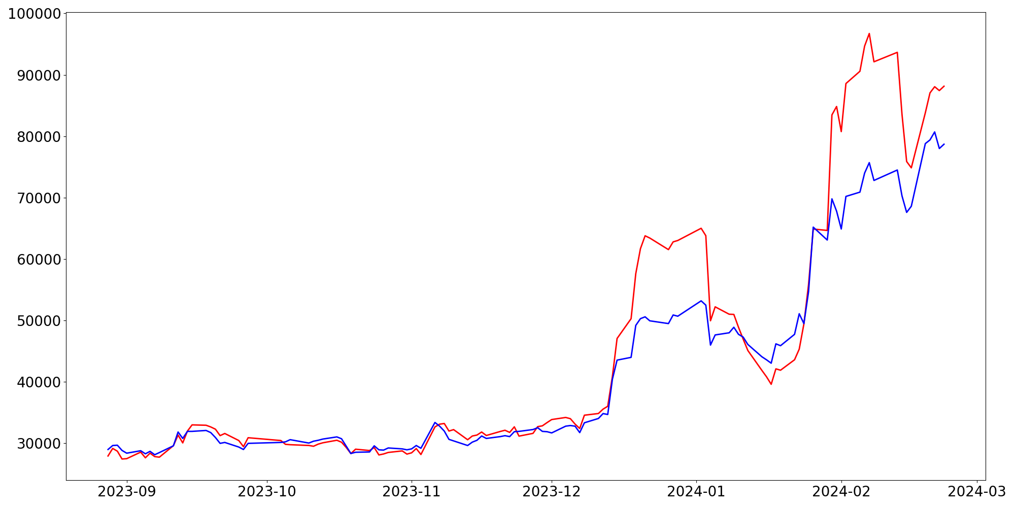 [ - : 실제값(종가) / - : 예측값(종가) ]
