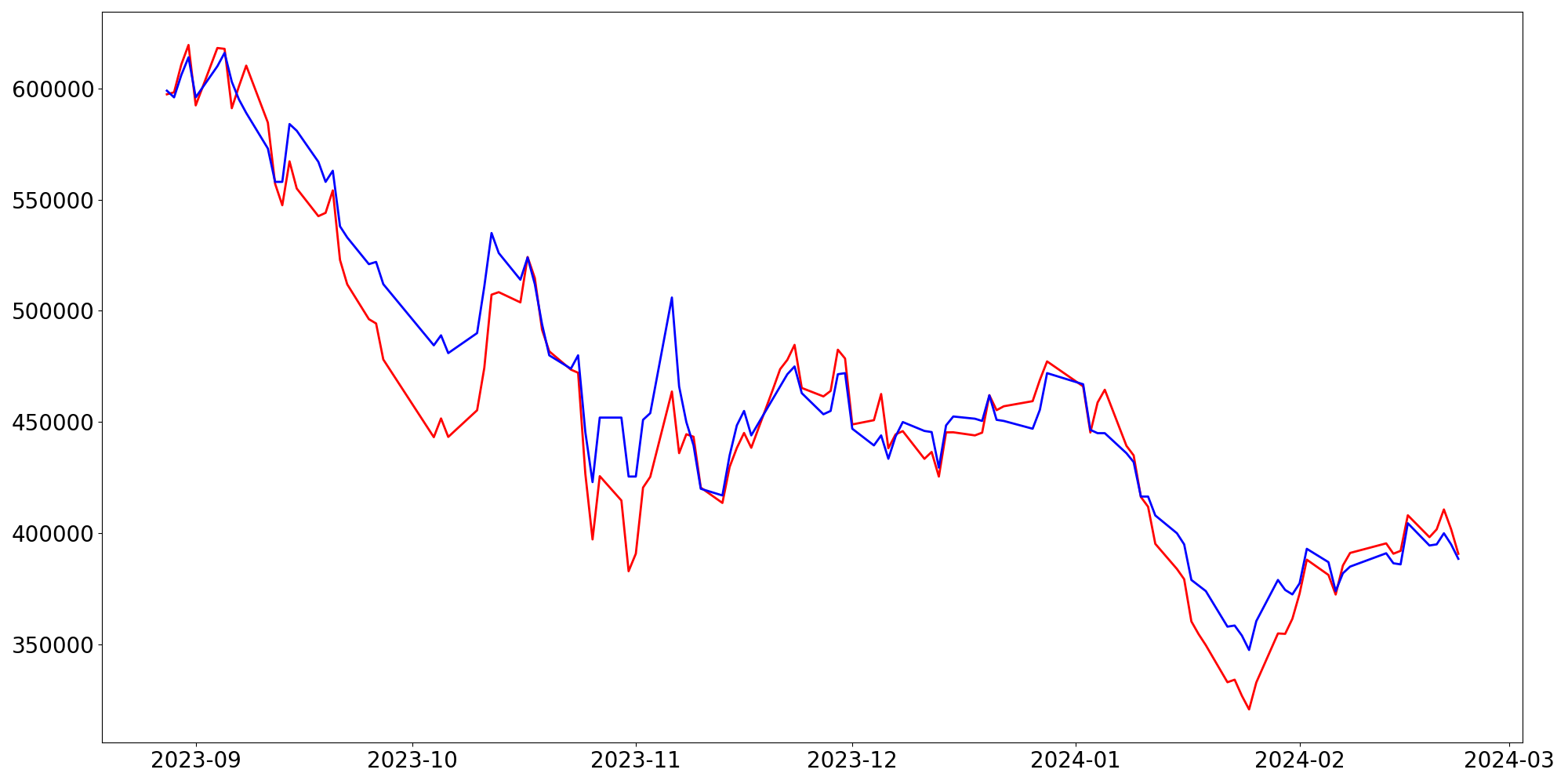 [ - : 실제값(종가) / - : 예측값(종가) ]