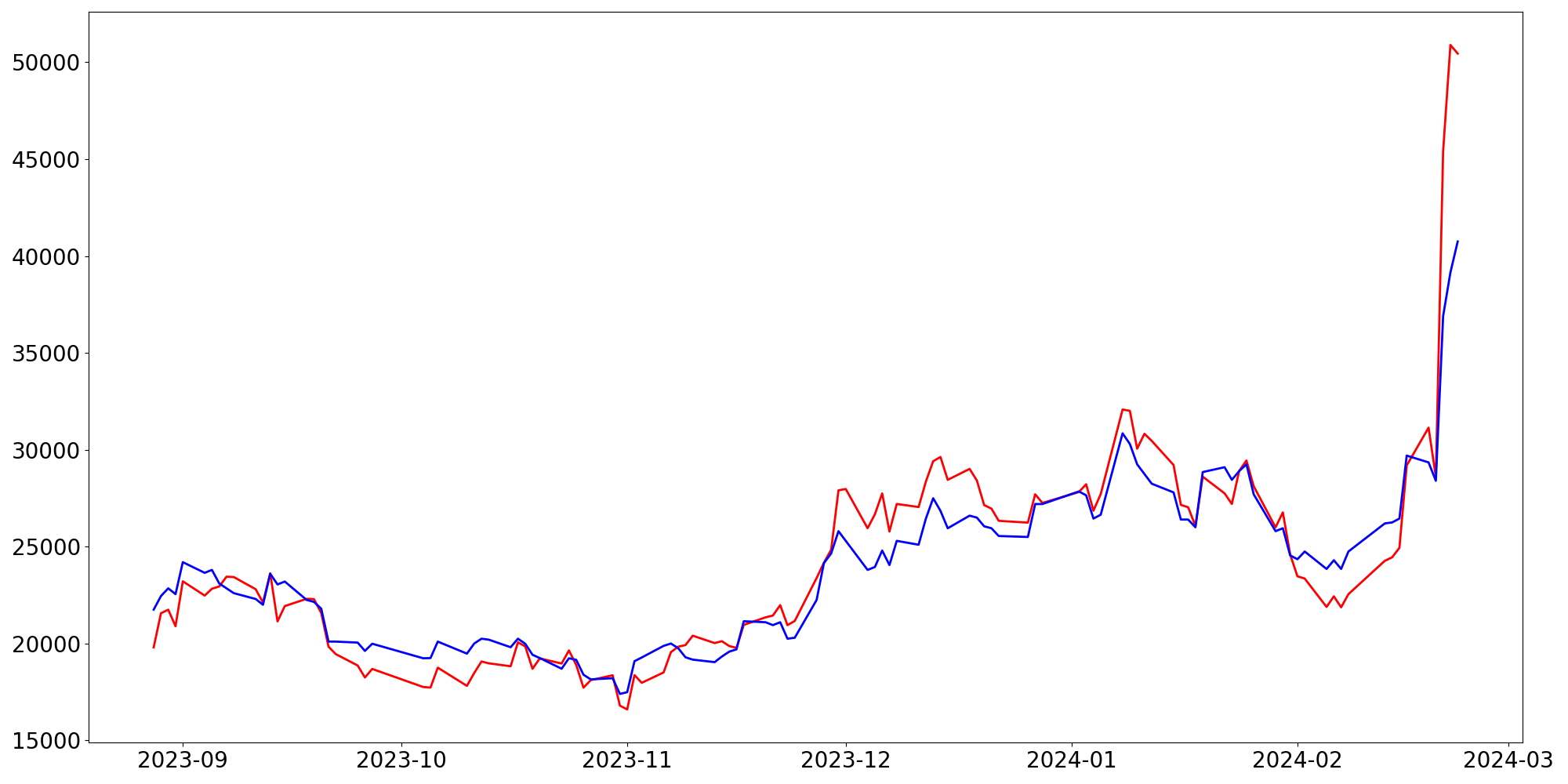 [ - : 실제값(종가) / - : 예측값(종가) ]