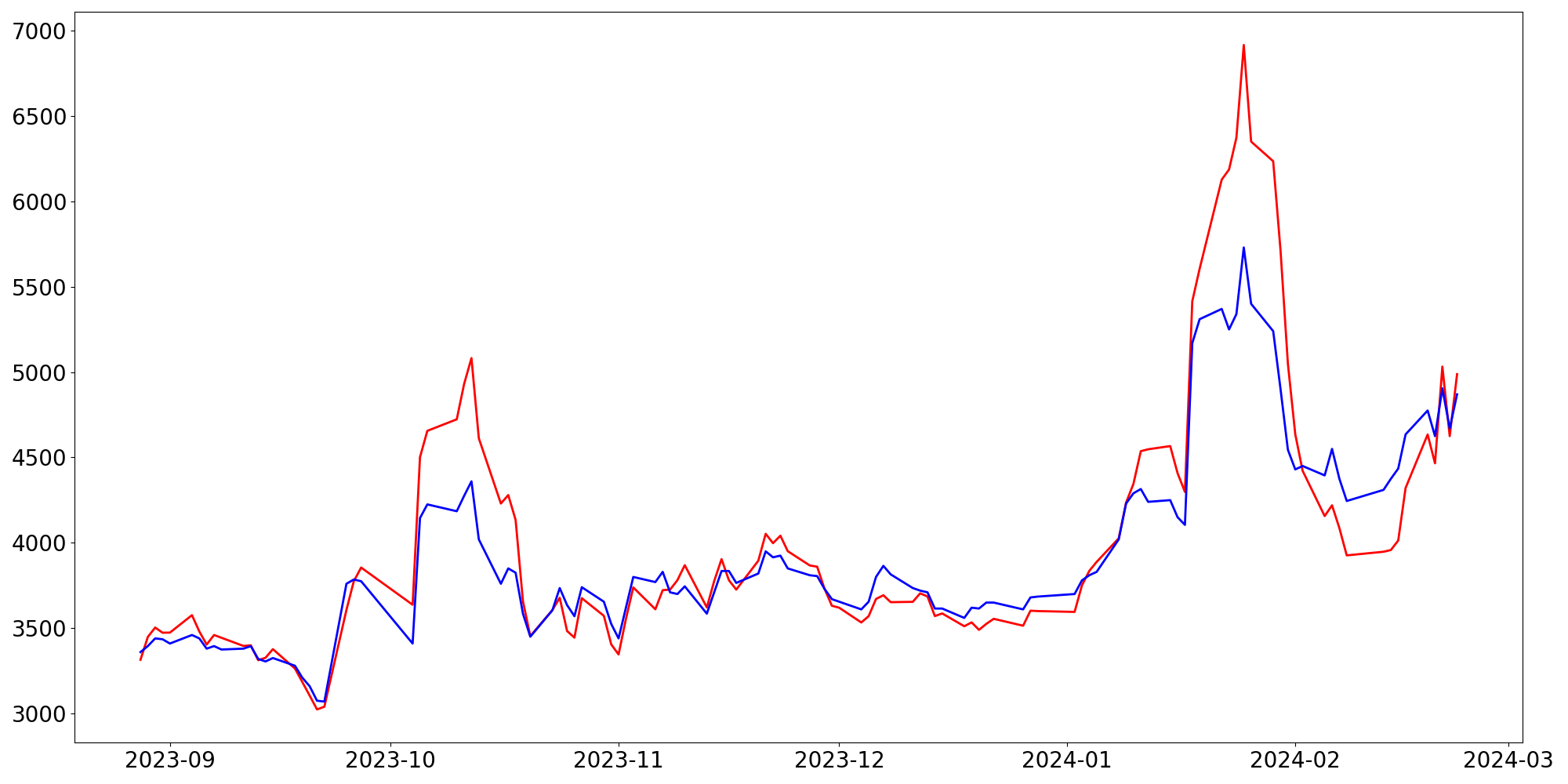 [ - : 실제값(종가) / - : 예측값(종가) ]
