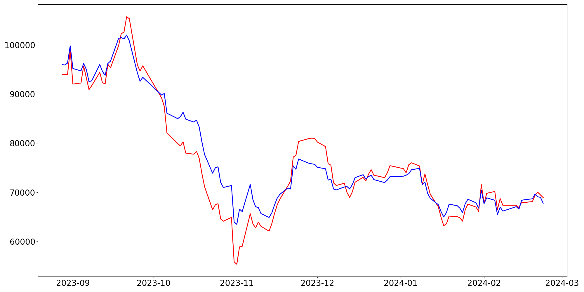 [ - : 실제값(종가) / - : 예측값(종가) ]