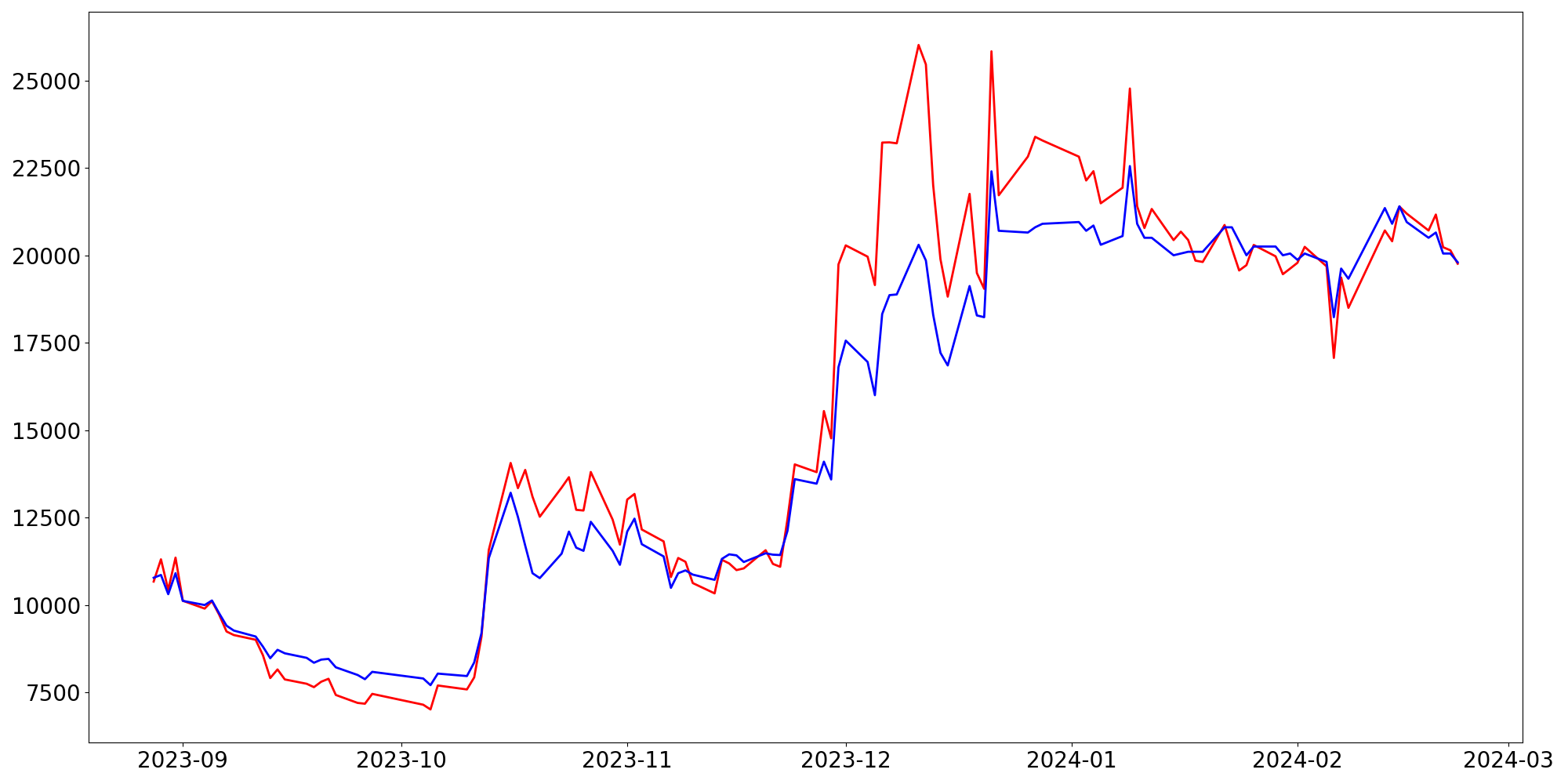 [ - : 실제값(종가) / - : 예측값(종가) ]