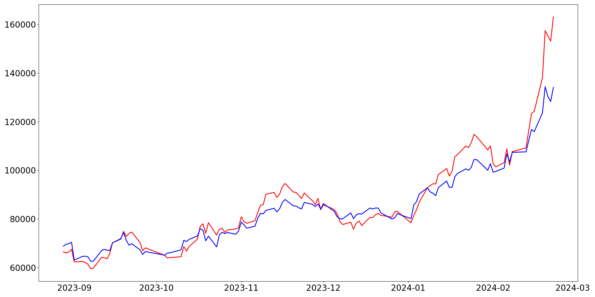 [ - : 실제값(종가) / - : 예측값(종가) ]