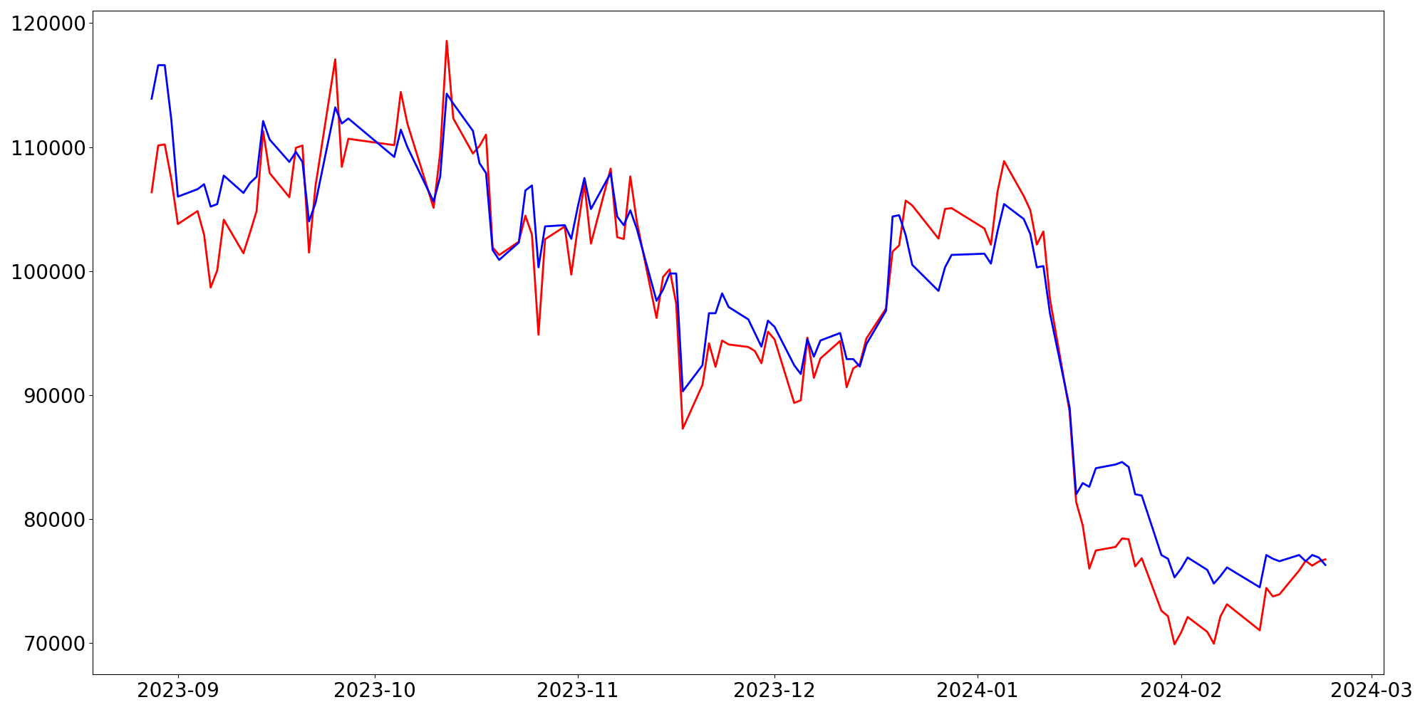 [ - : 실제값(종가) / - : 예측값(종가) ]