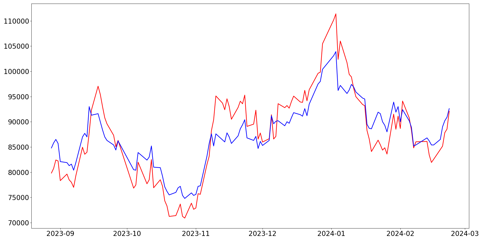 [ - : 실제값(종가) / - : 예측값(종가) ]