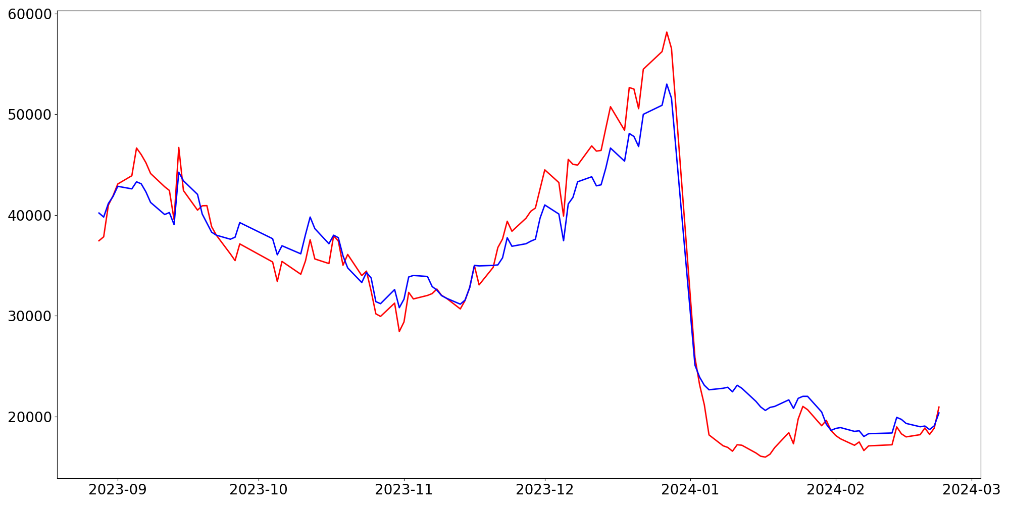 [ - : 실제값(종가) / - : 예측값(종가) ]