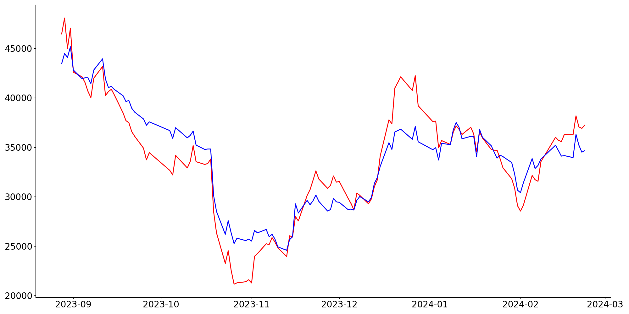 [ - : 실제값(종가) / - : 예측값(종가) ]