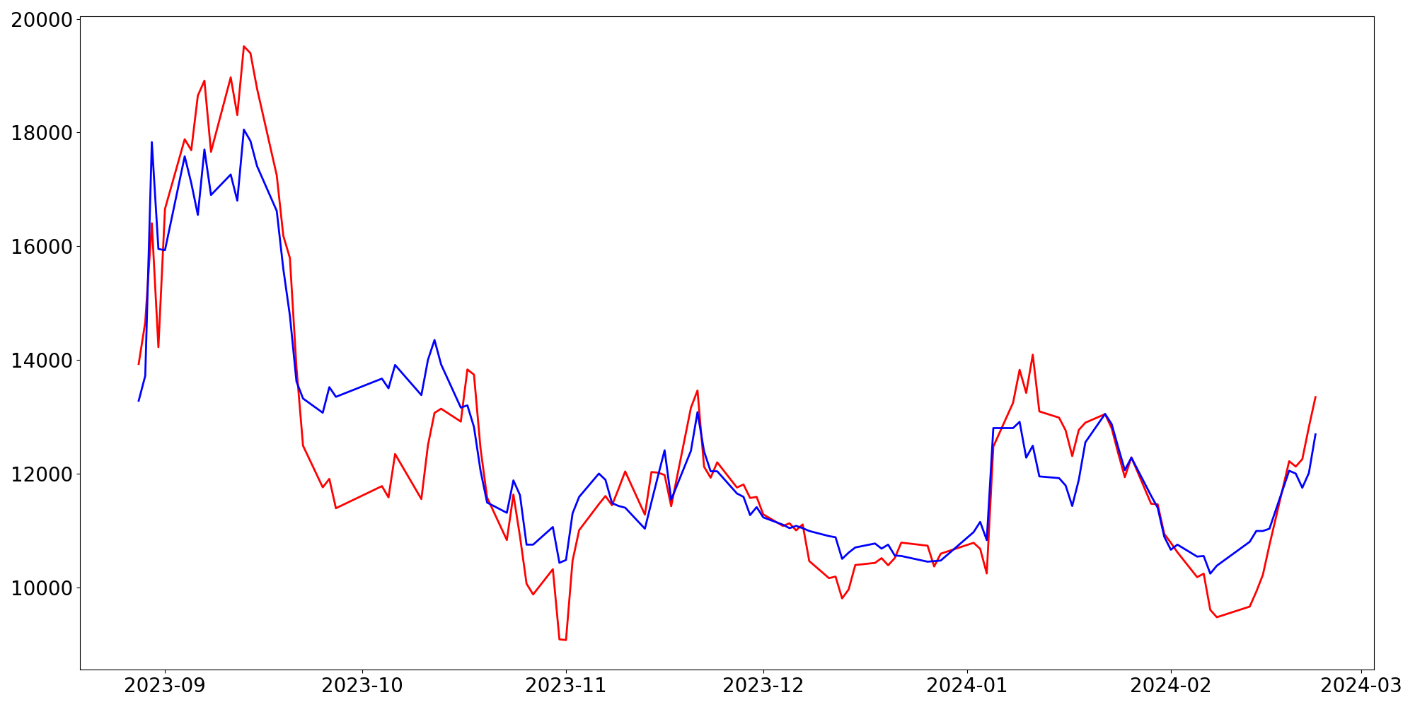 [ - : 실제값(종가) / - : 예측값(종가) ]