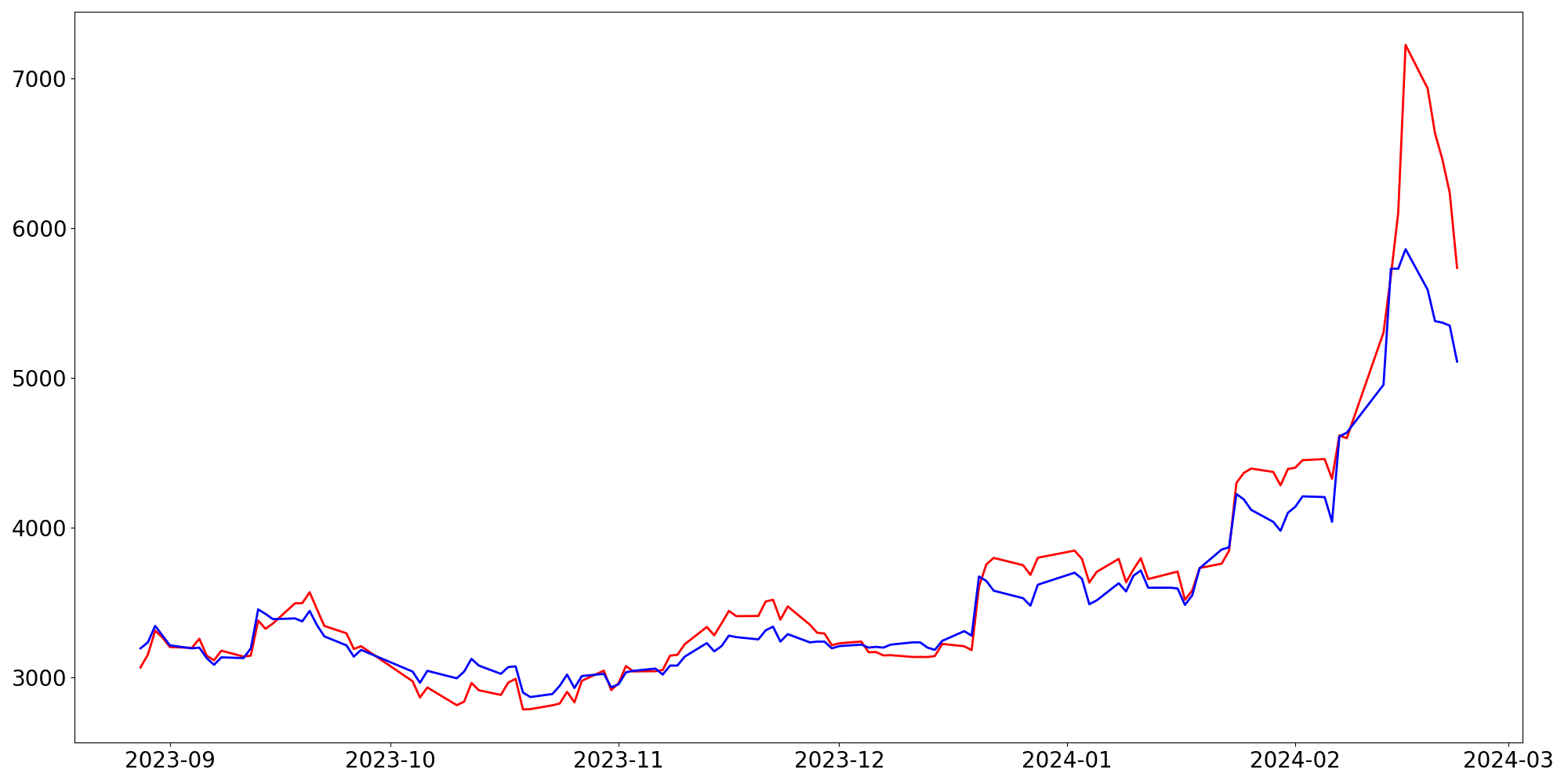 [ - : 실제값(종가) / - : 예측값(종가) ]