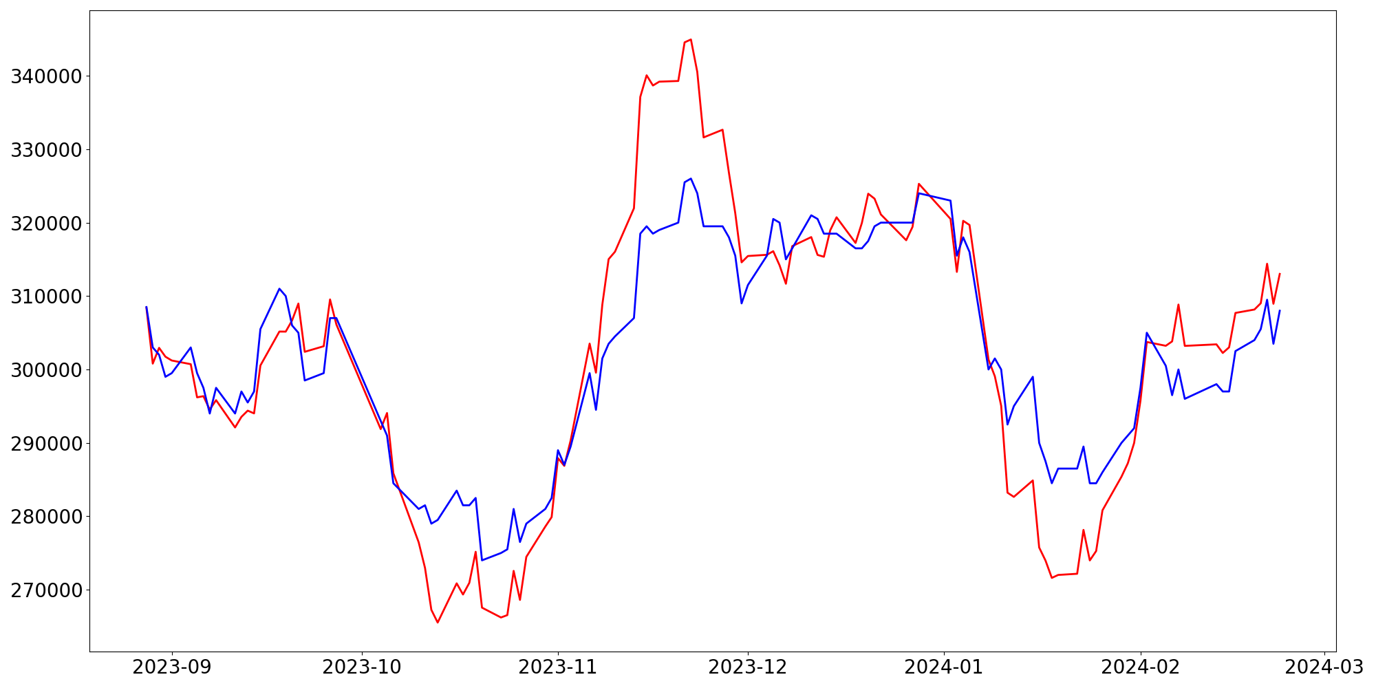 [ - : 실제값(종가) / - : 예측값(종가) ]