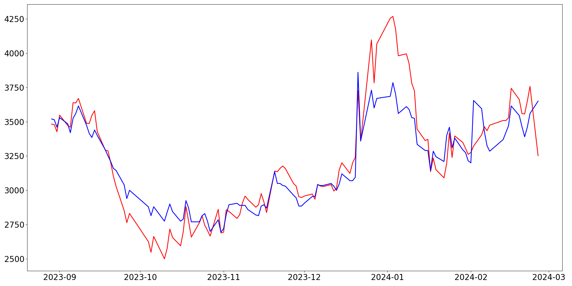 [ - : 실제값(종가) / - : 예측값(종가) ]
