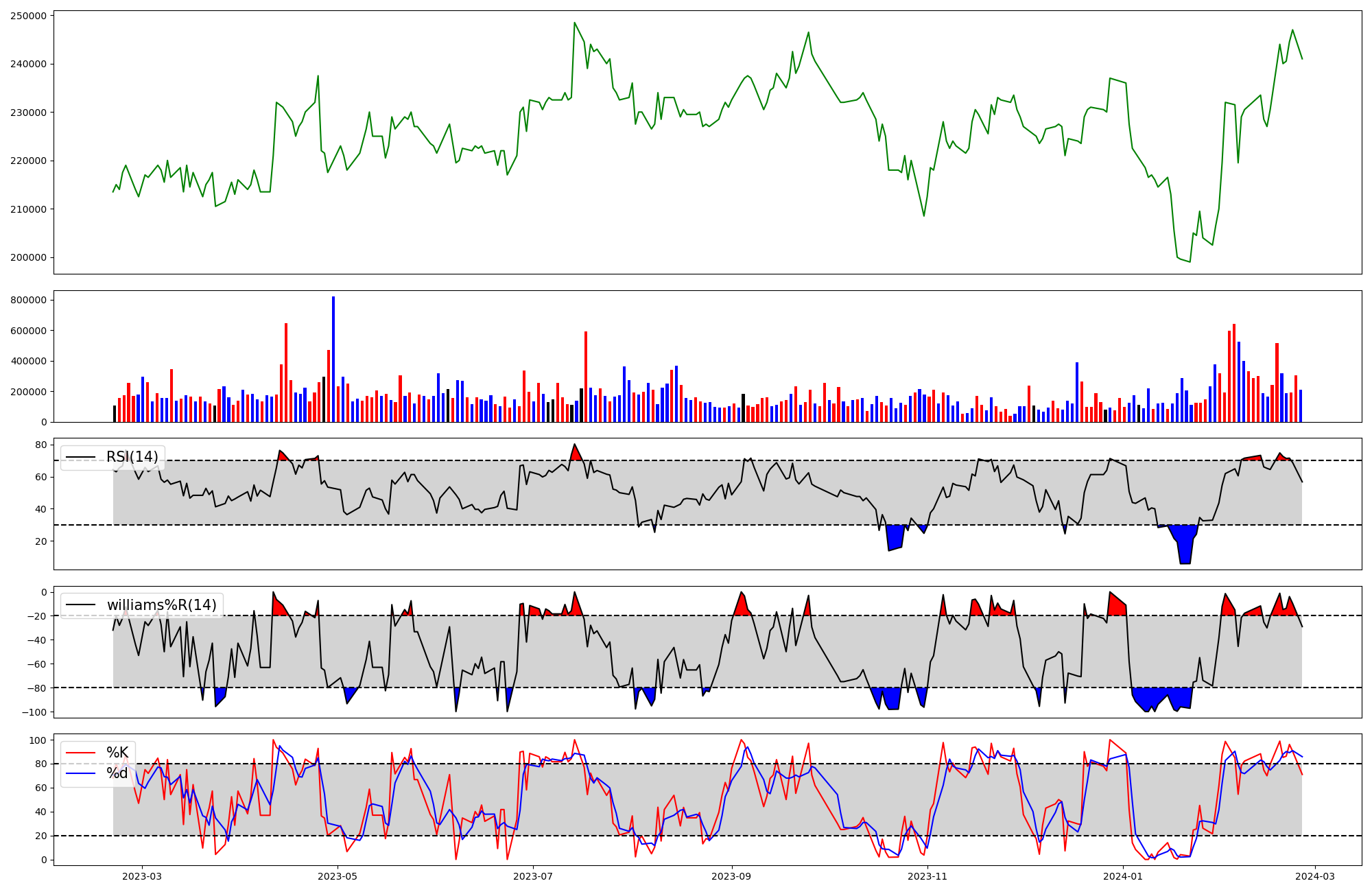 □ 중기 : 현재 종가가 중기(60일) 이동평균값(223,527원)을 상회 하여 중기적 추세 상승 중