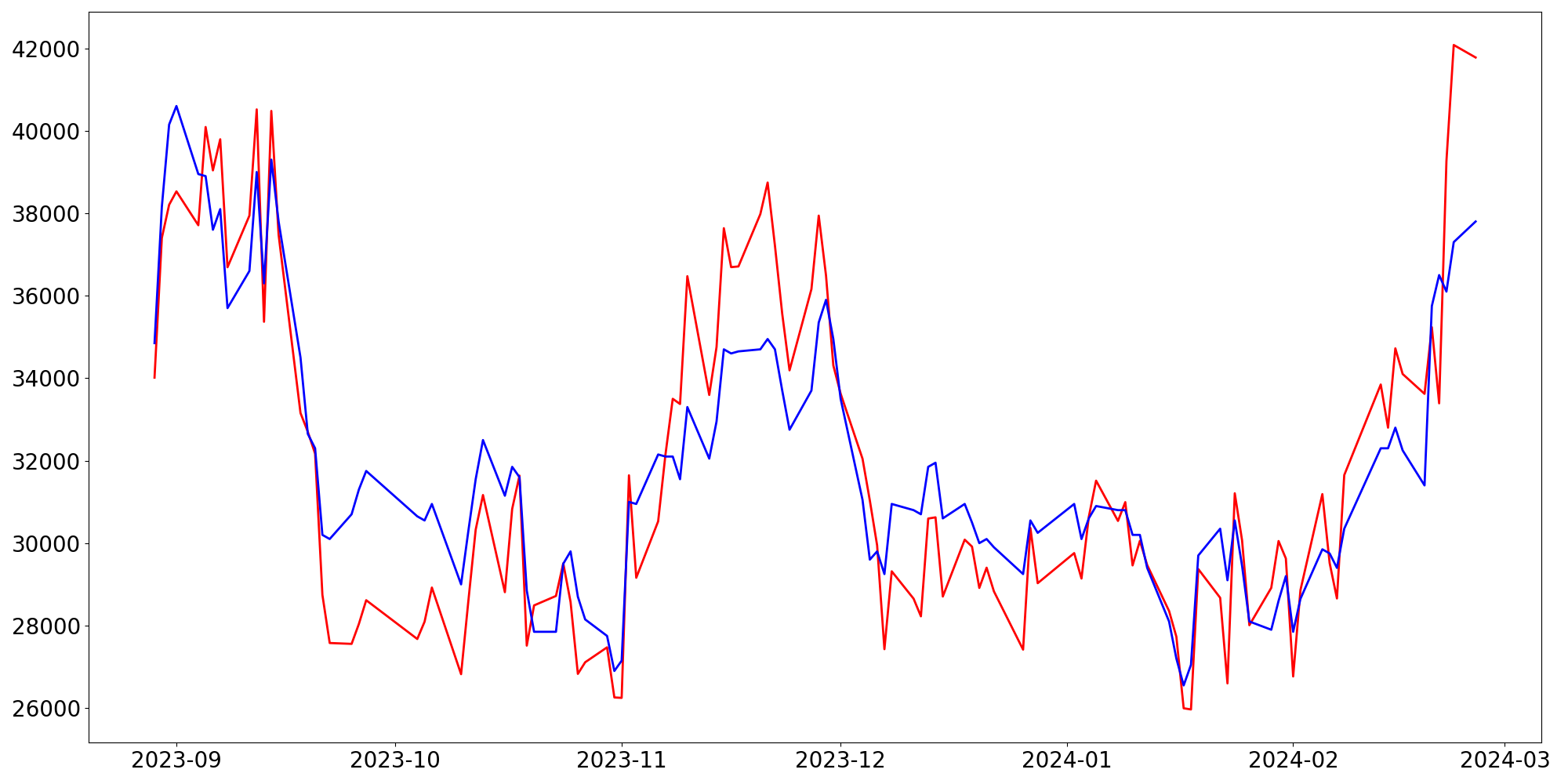 [ - : 실제값(종가) / - : 예측값(종가) ]