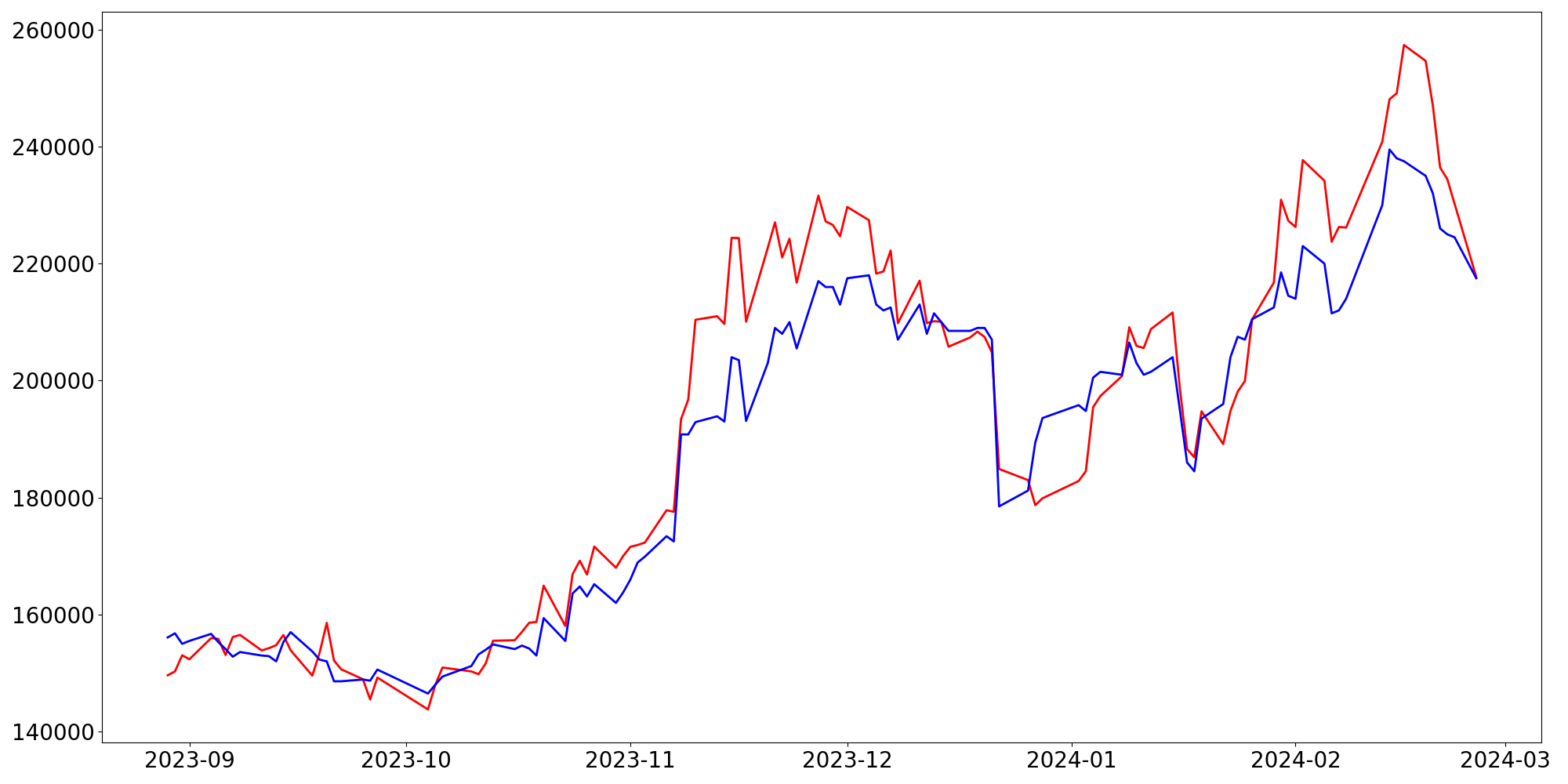 [ - : 실제값(종가) / - : 예측값(종가) ]