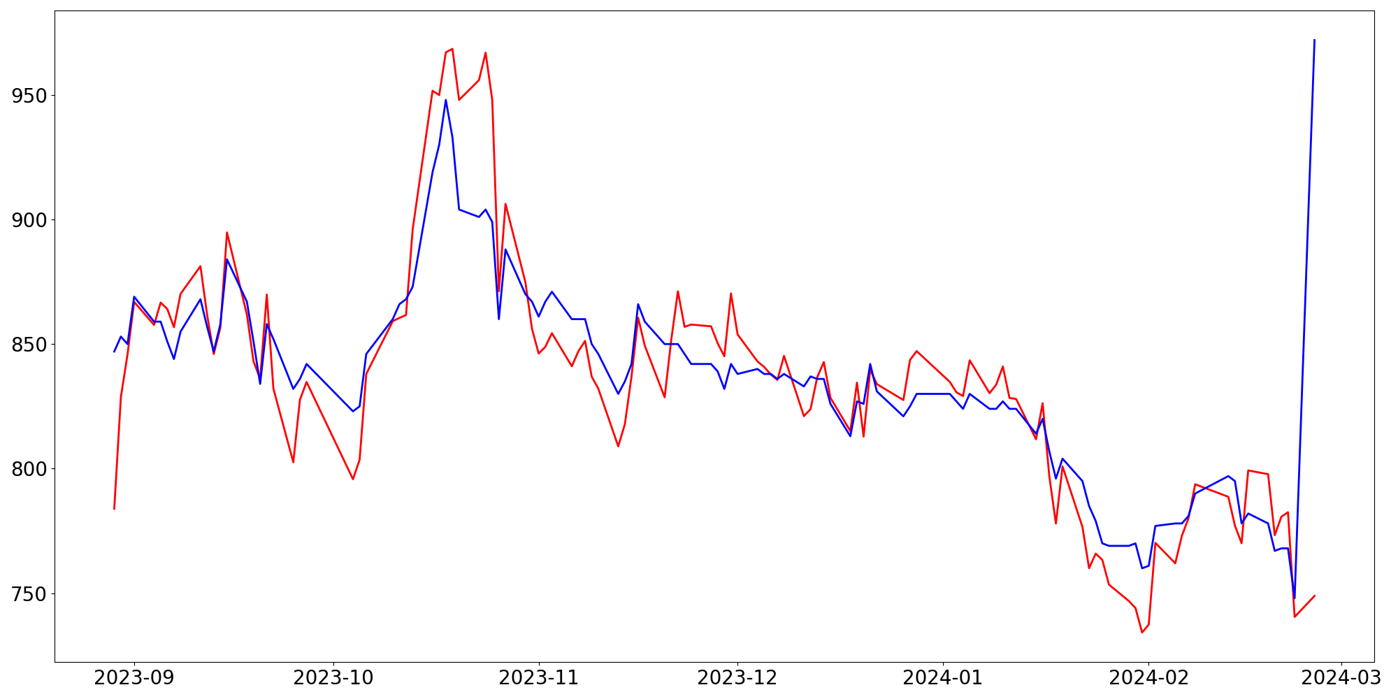 [ - : 실제값(종가) / - : 예측값(종가) ]