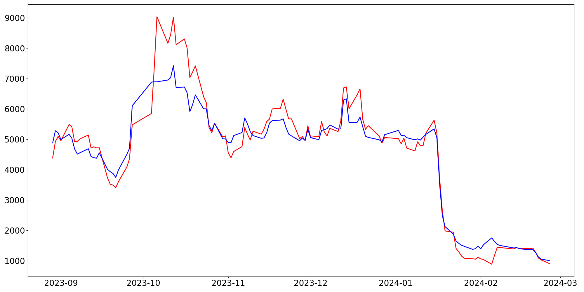 [ - : 실제값(종가) / - : 예측값(종가) ]