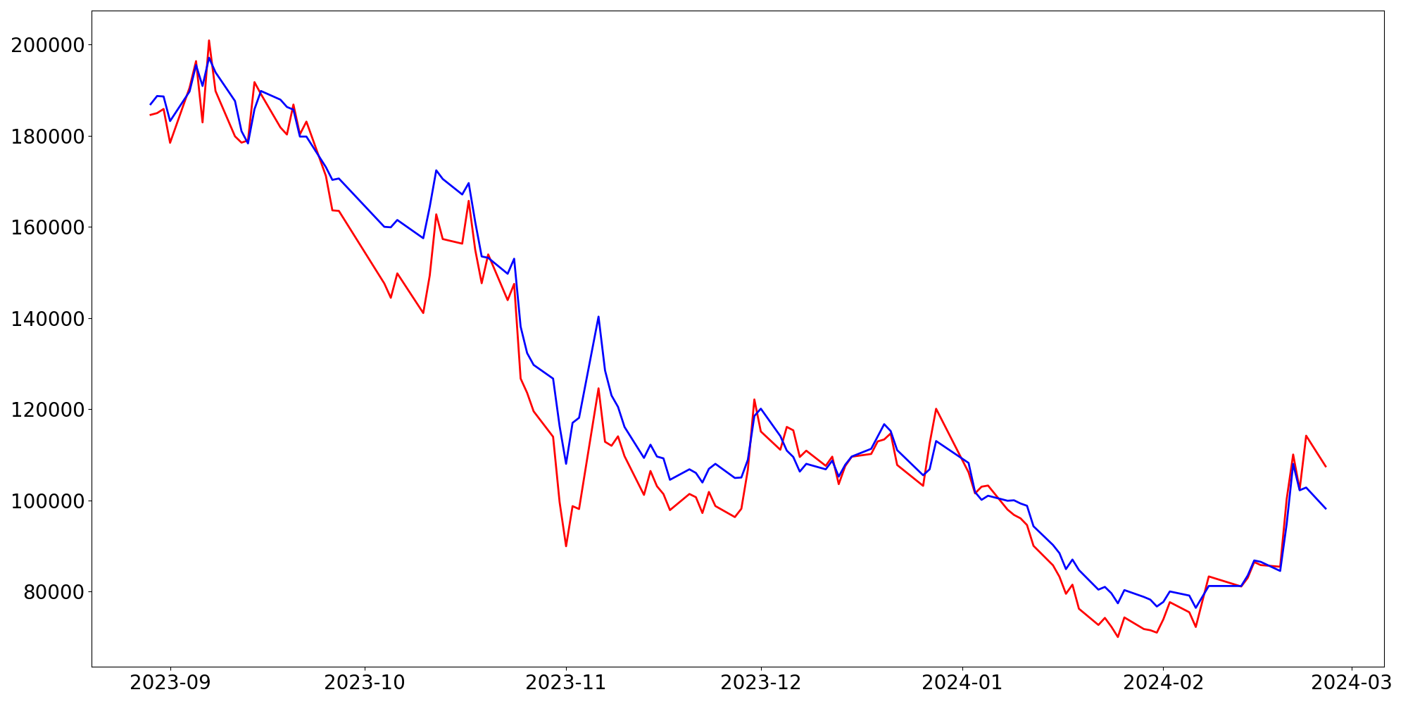 [ - : 실제값(종가) / - : 예측값(종가) ]