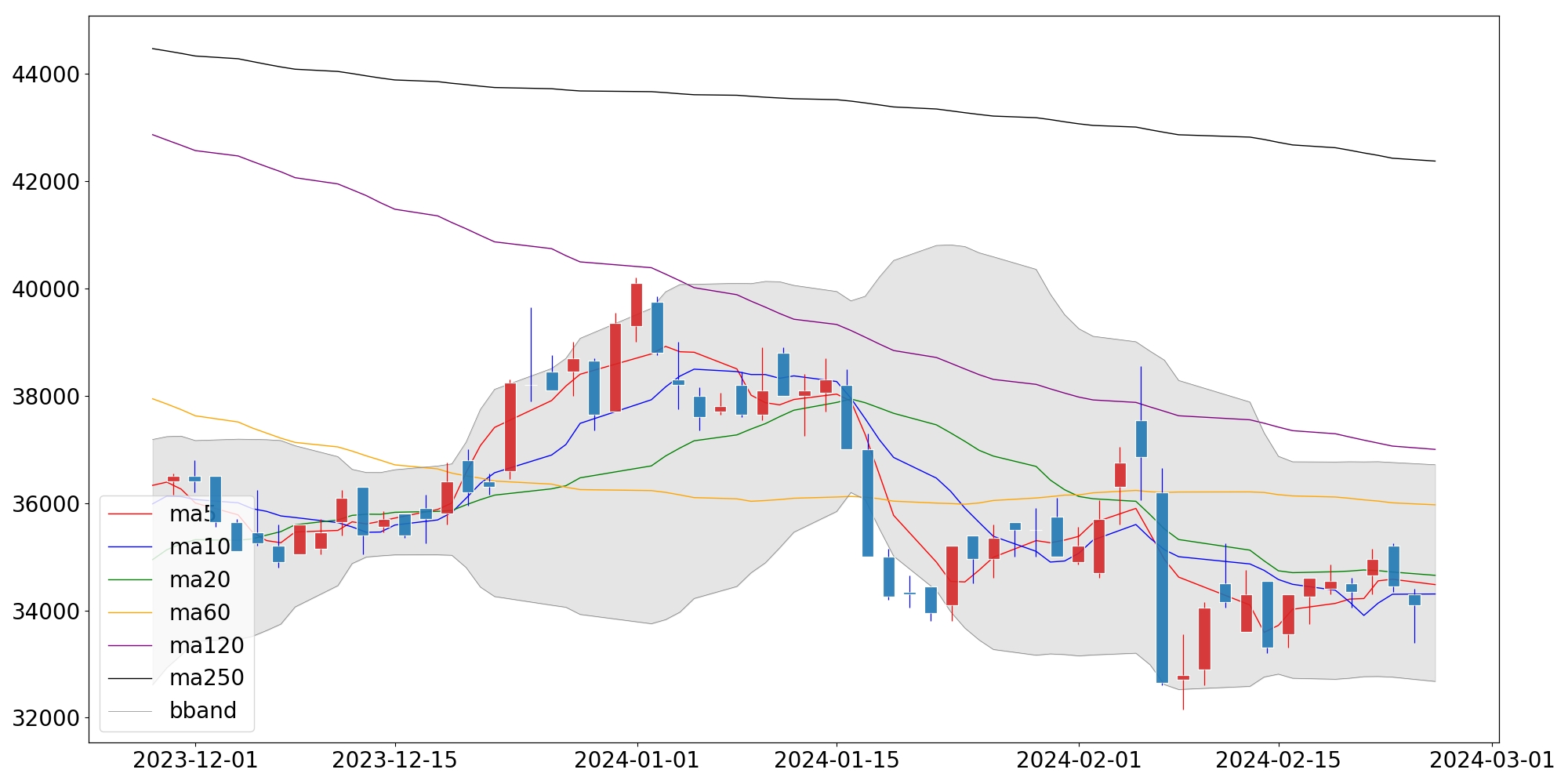 □ 중기 : 현재 종가가 중기(60일) 이동평균값(35,967원)을 하회 하여 중기적 추세 하락 중