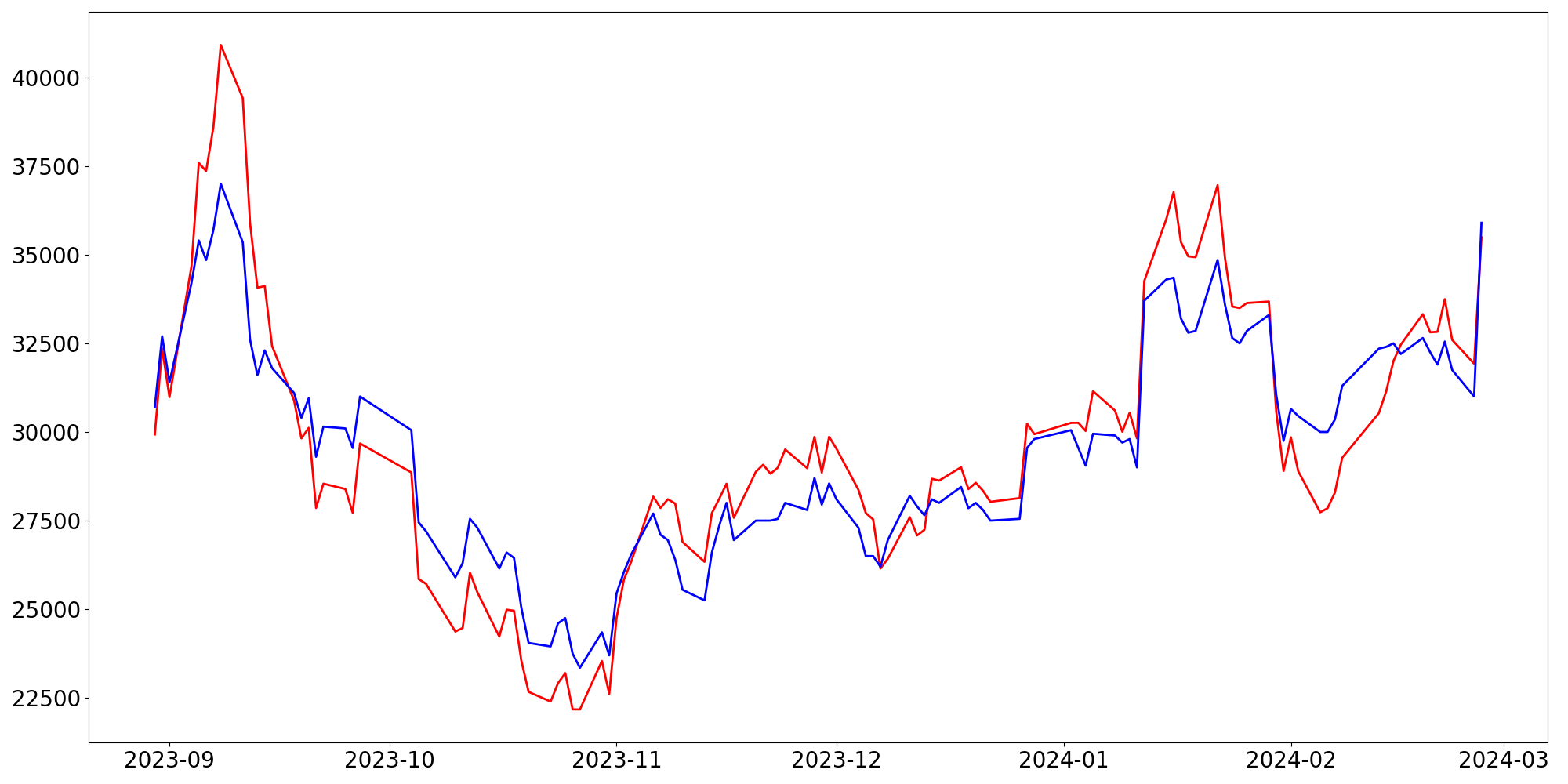 [ - : 실제값(종가) / - : 예측값(종가) ]