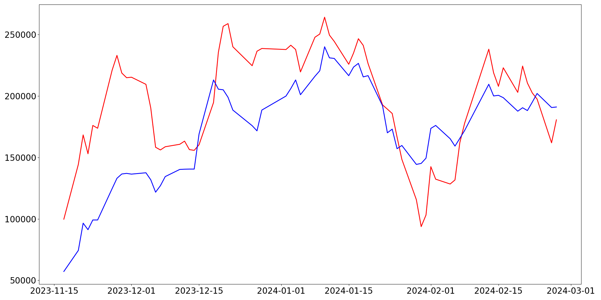 [ - : 실제값(종가) / - : 예측값(종가) ]