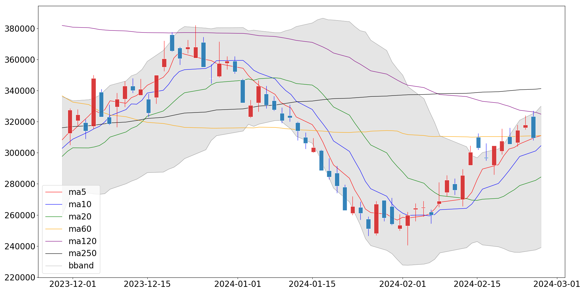 □ 중기 : 현재 종가가 중기(60일) 이동평균값(311,000원)을 하회 하여 중기적 추세 하락 중