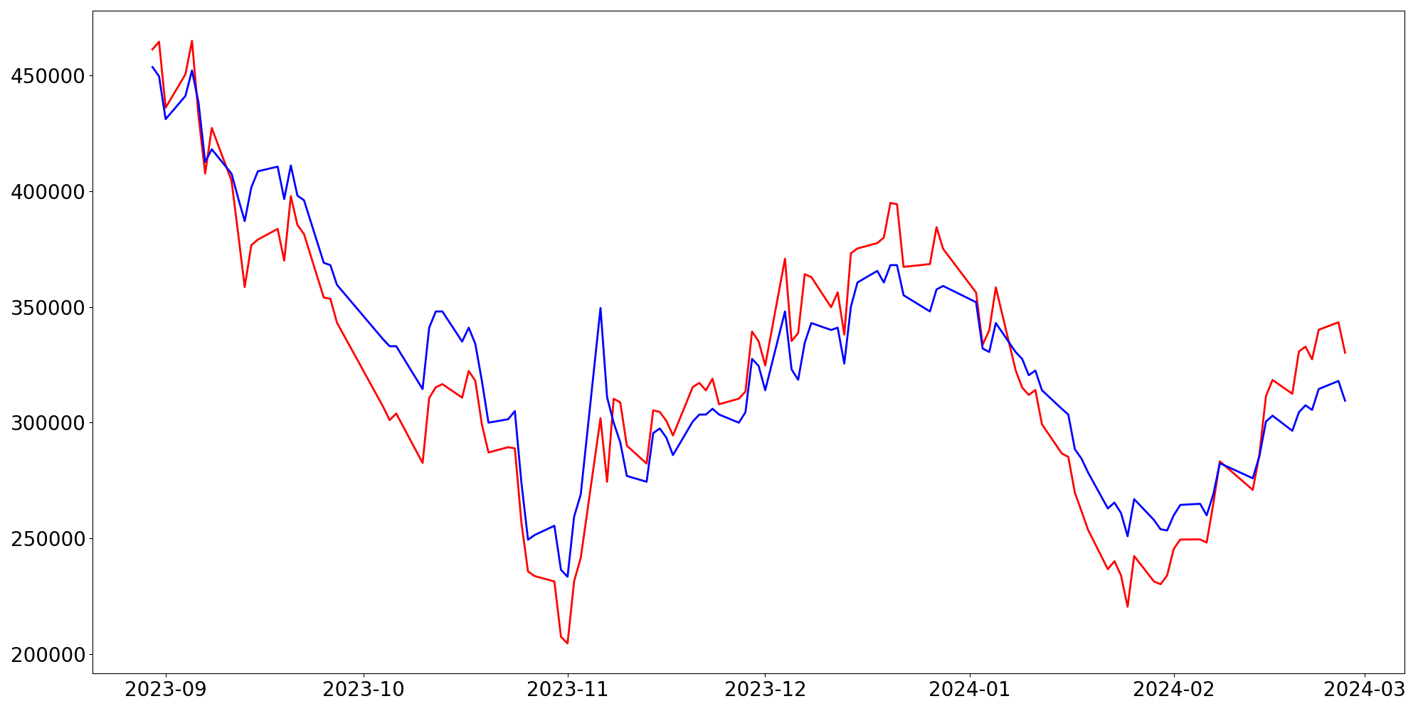[ - : 실제값(종가) / - : 예측값(종가) ]