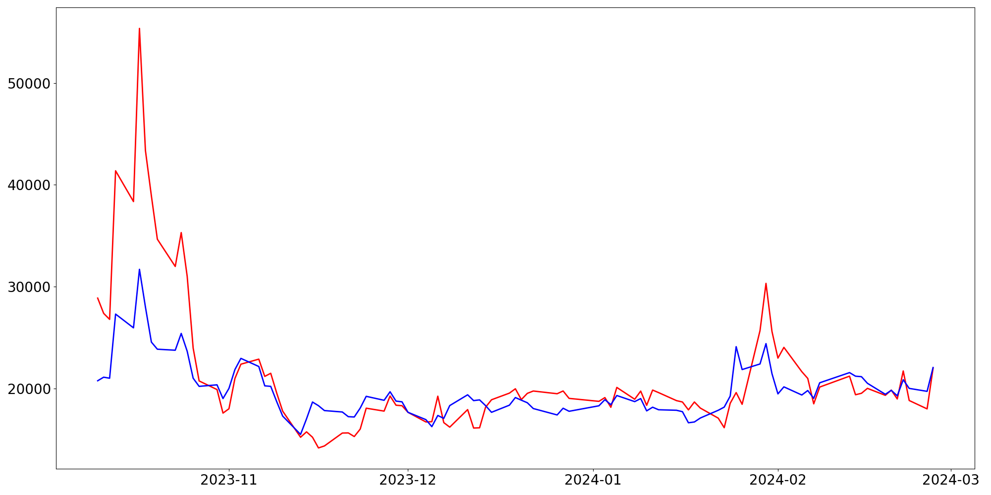 [ - : 실제값(종가) / - : 예측값(종가) ]