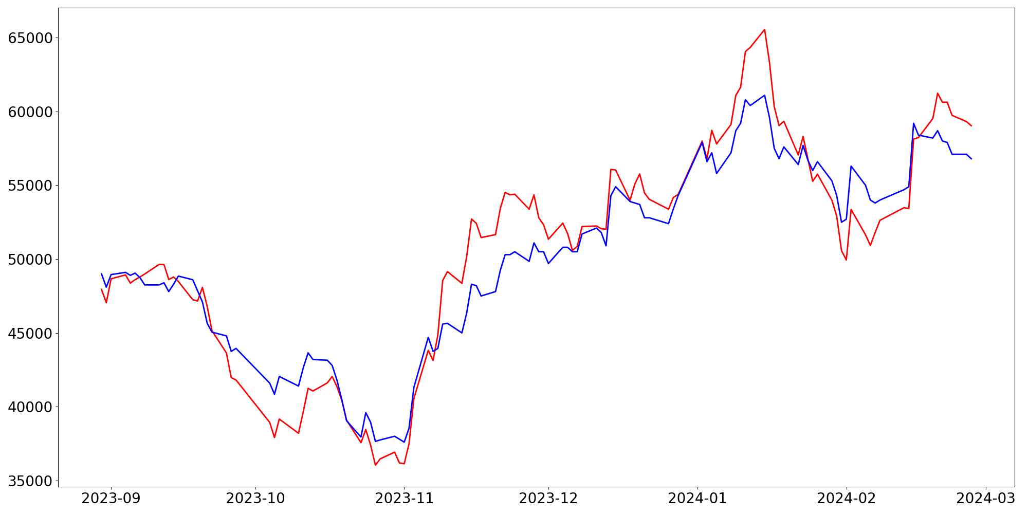 [ - : 실제값(종가) / - : 예측값(종가) ]