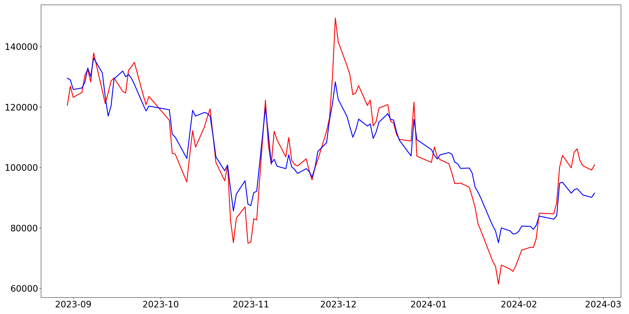 [ - : 실제값(종가) / - : 예측값(종가) ]