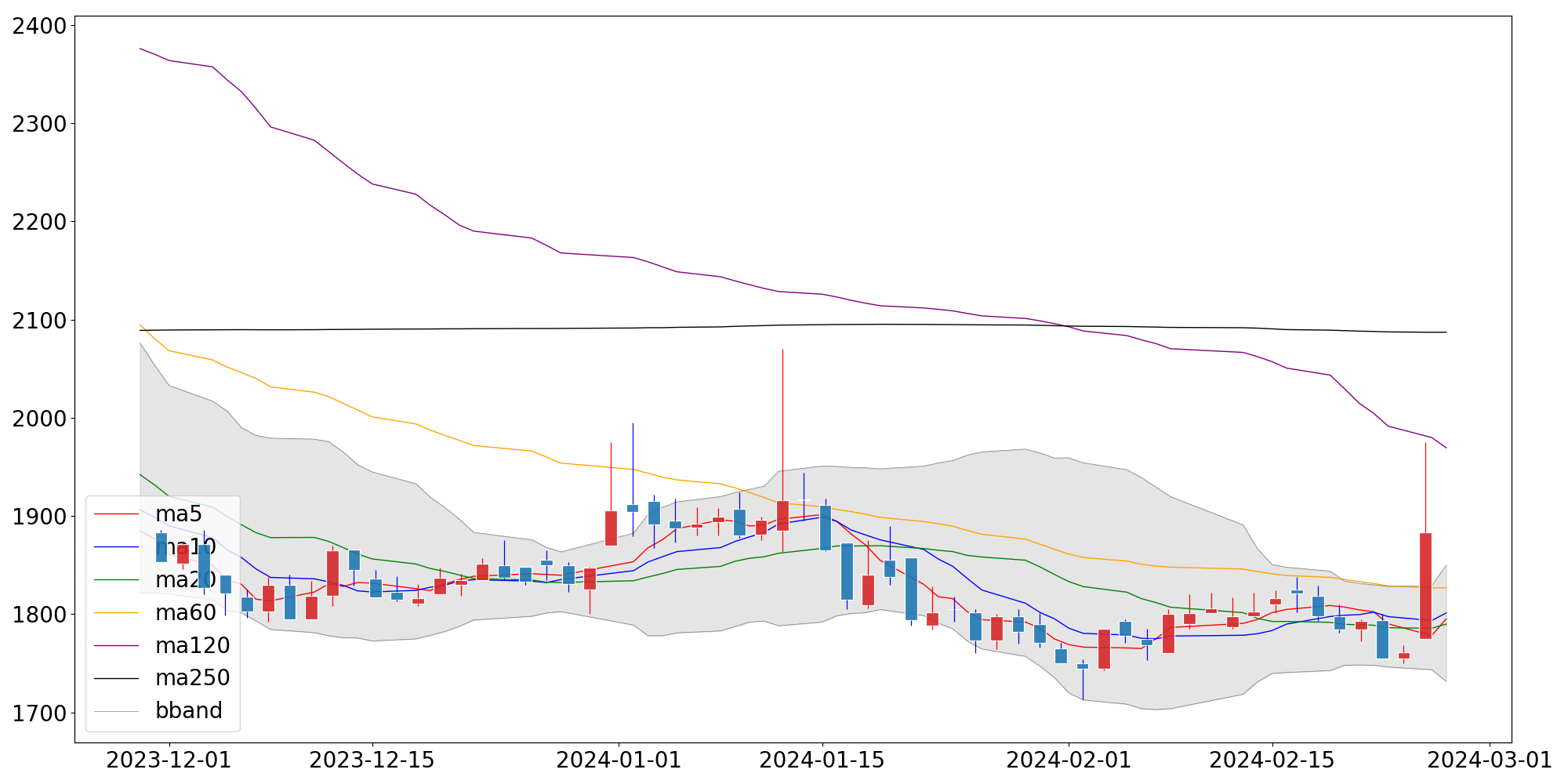 □ 중기 : 현재 종가가 중기(60일) 이동평균값(1,827원)을 상회 하여 중기적 추세 상승 중