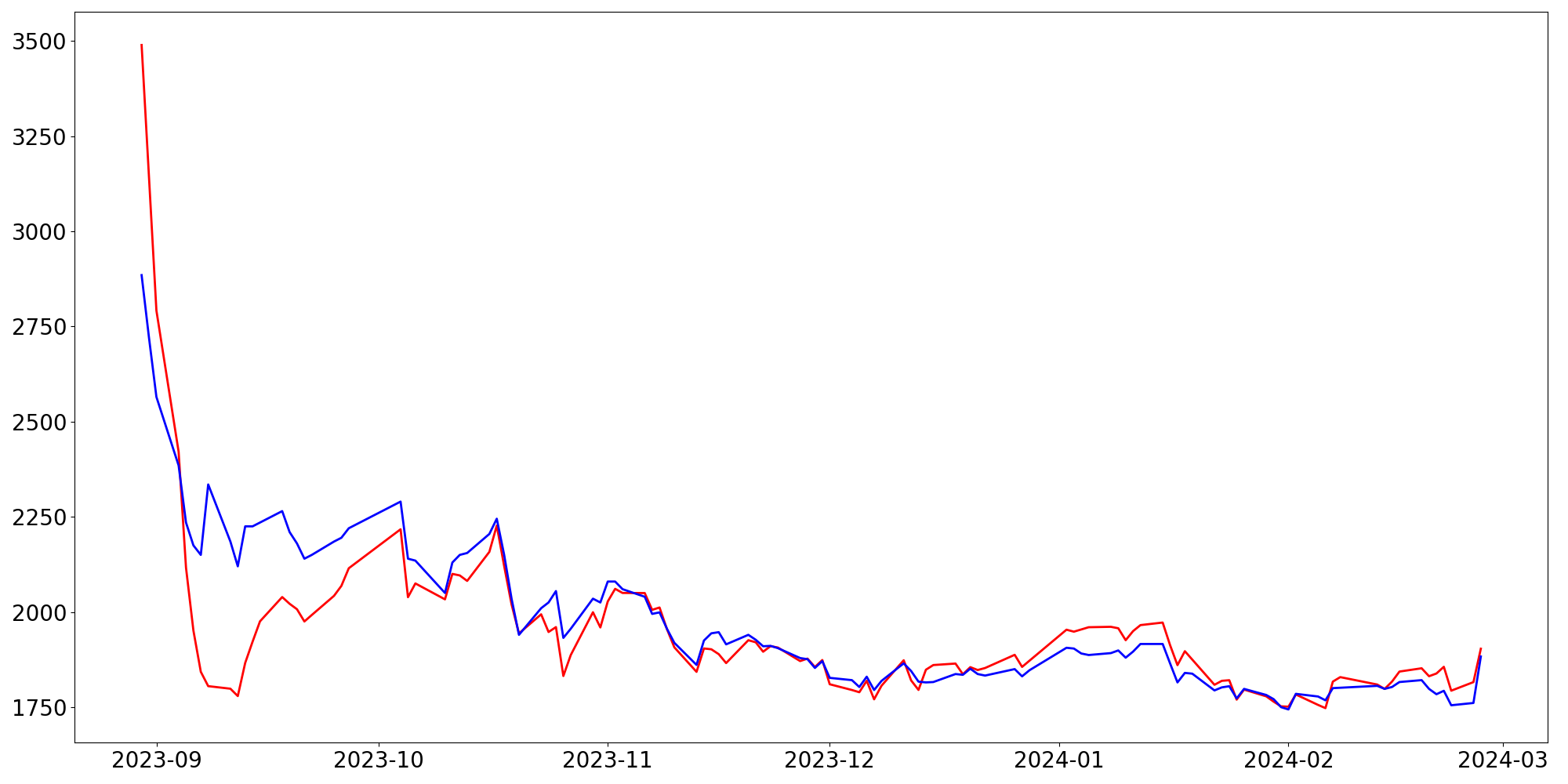 [ - : 실제값(종가) / - : 예측값(종가) ]