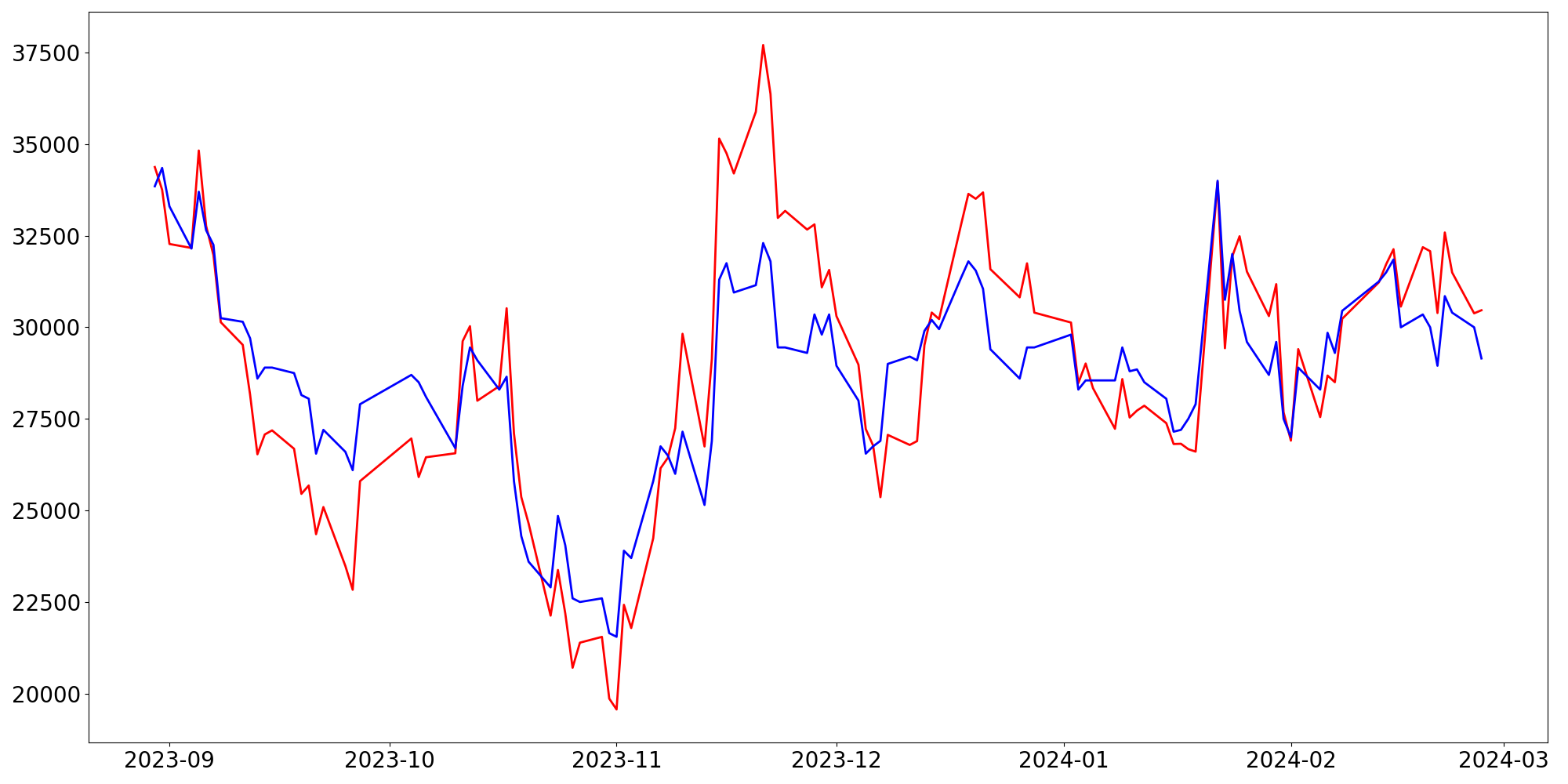 [ - : 실제값(종가) / - : 예측값(종가) ]