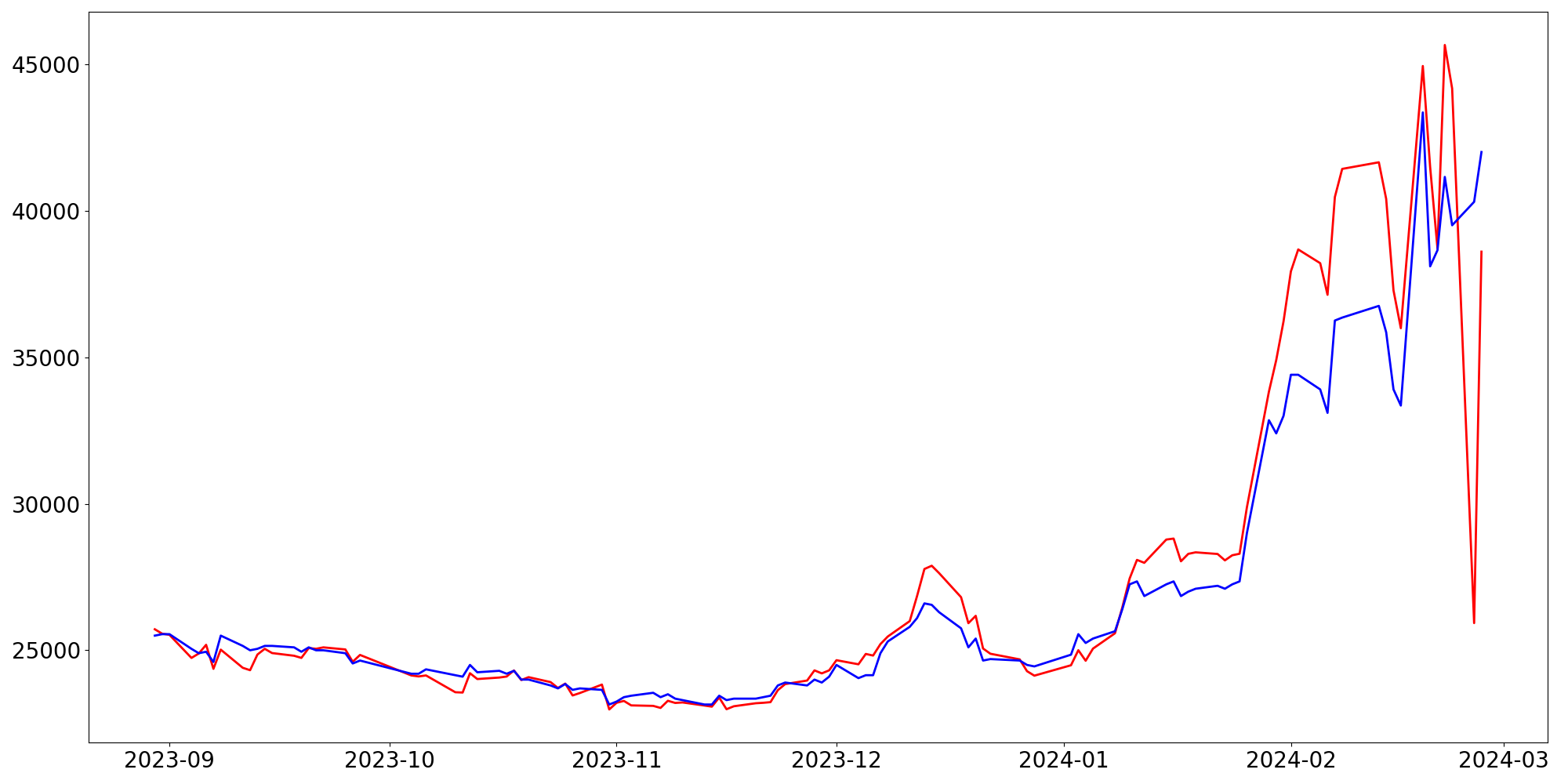 [ - : 실제값(종가) / - : 예측값(종가) ]