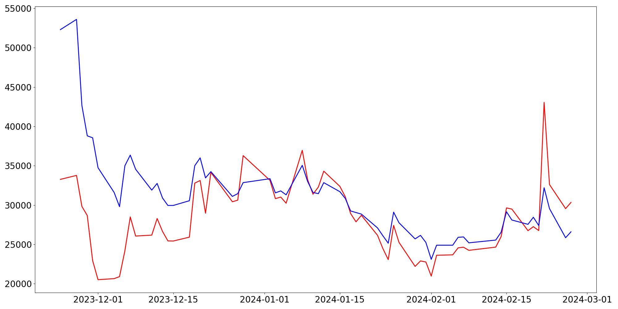 [ - : 실제값(종가) / - : 예측값(종가) ]